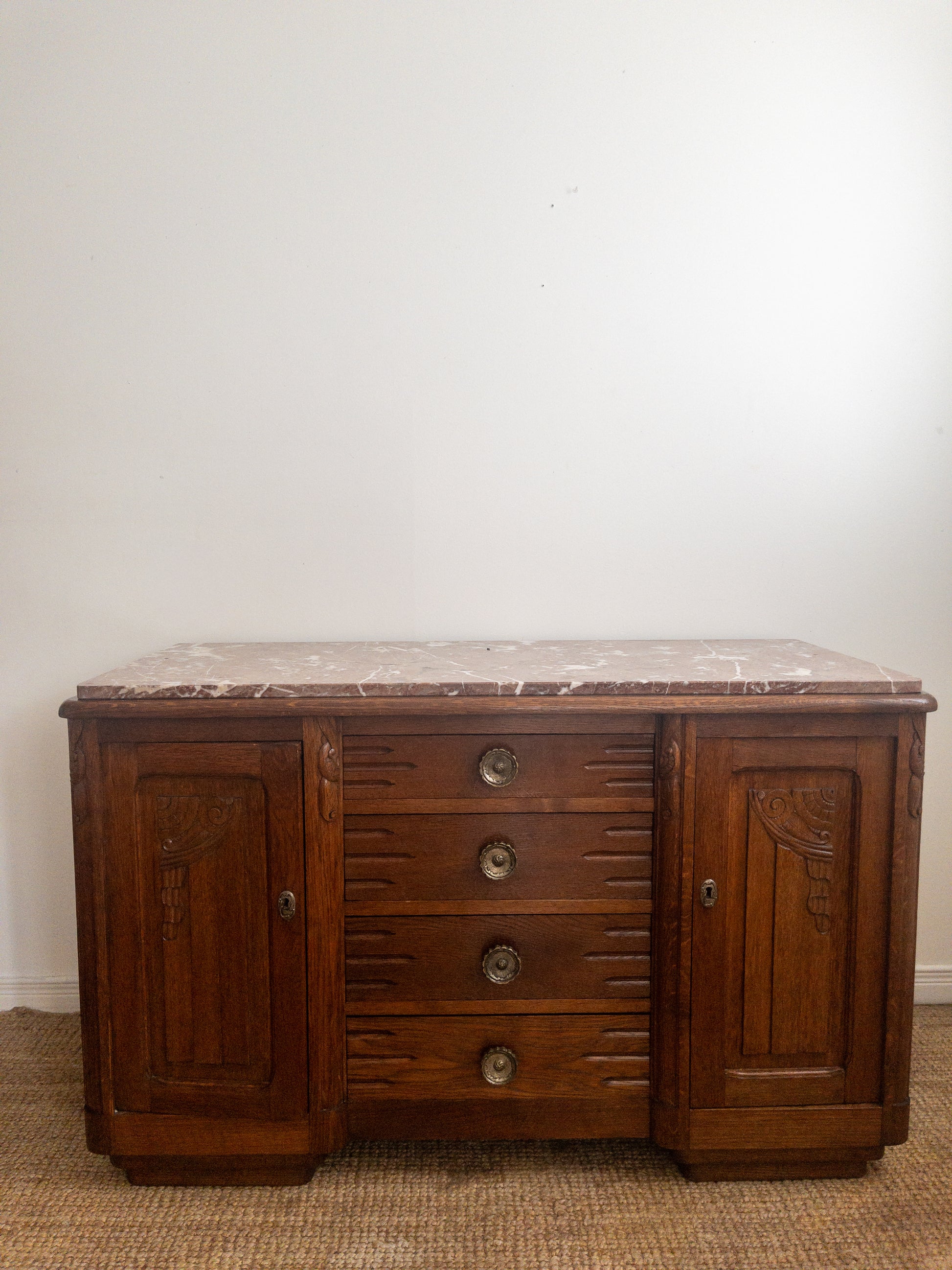 Stunning Art deco sideboard in solid oak. A beautiful shape with hand carved details. Features 4 drawers and 2 cabinets with a shelf each. Maintains its original bass hardware, including 2 gorgeous keyholes, unfortunately, no keys. Topped with the original marble.