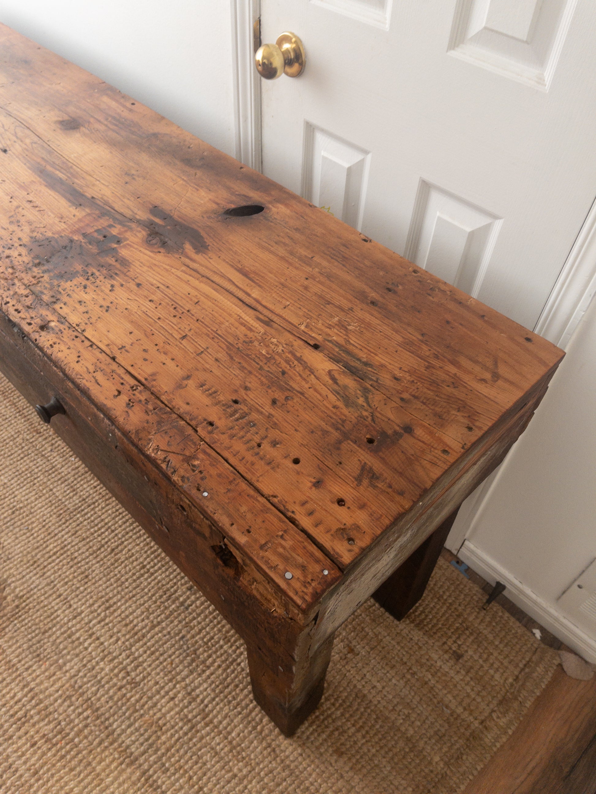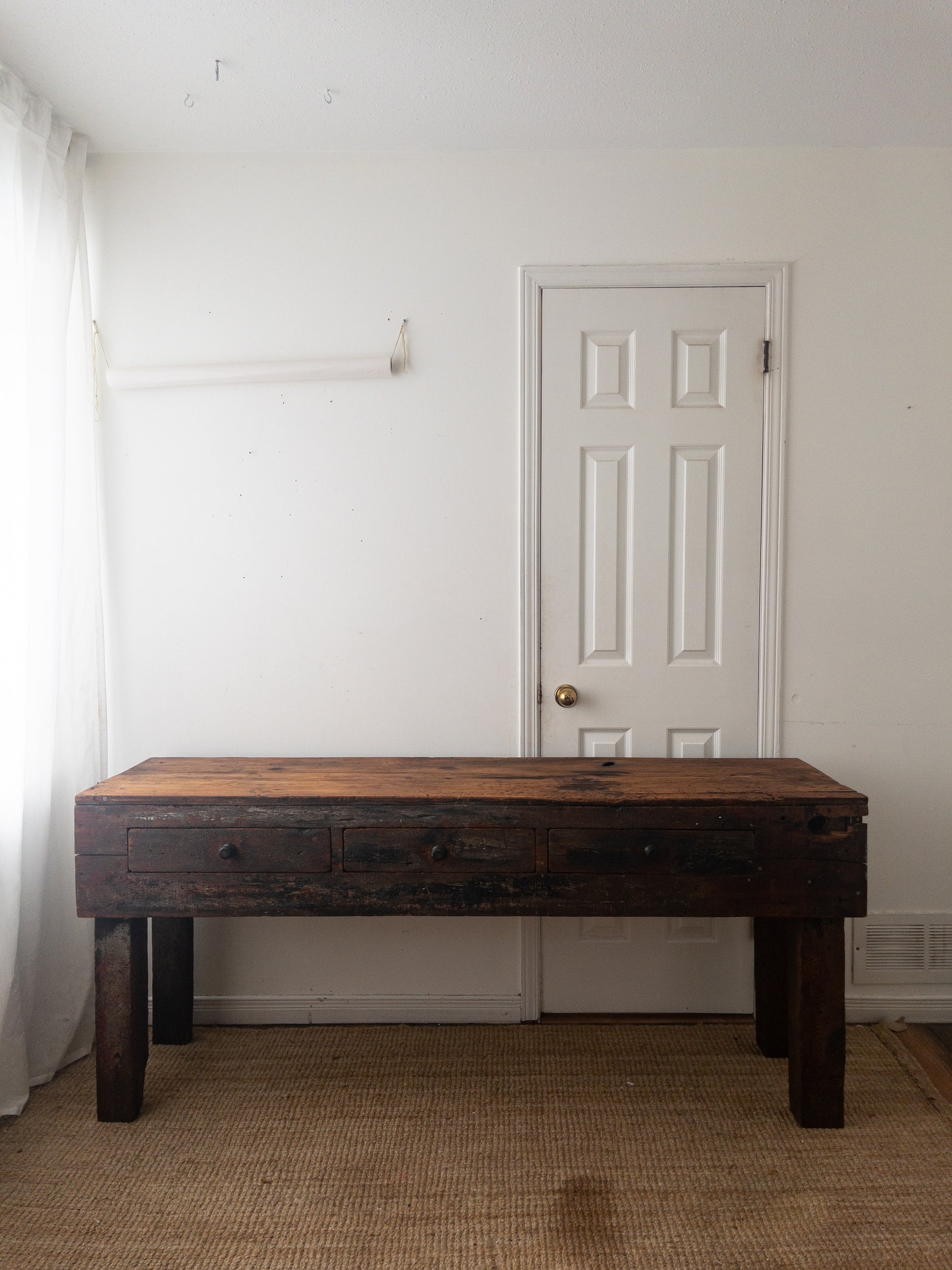 Large antique workbench with 3 drawers. Original hardware. Sourced in Harrowsmith, Ontario. circa unknown.