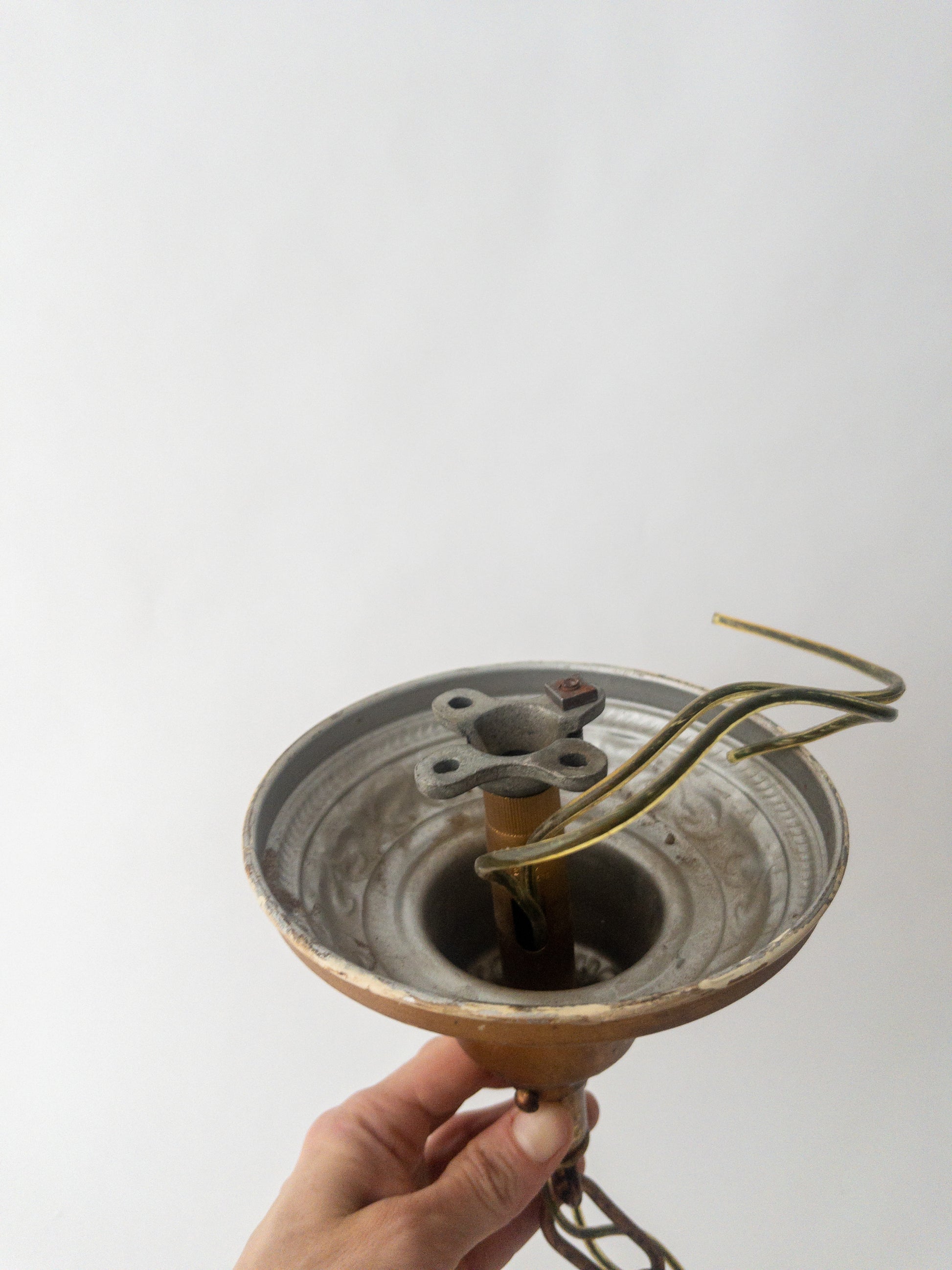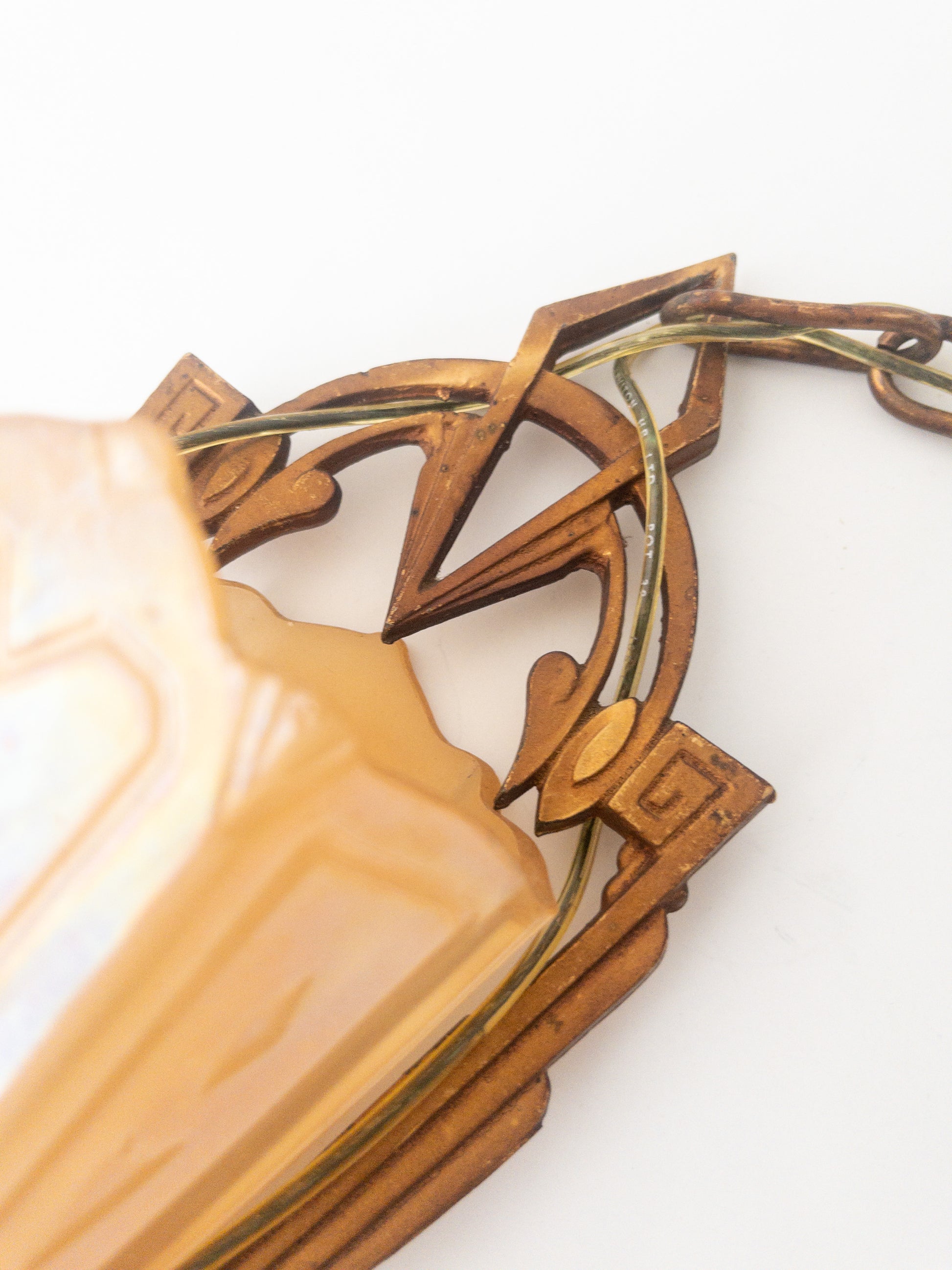 Markle brand art deco ceiling light with glass peach colored iridescent slip shade. circa 1930. Original ceiling mount, missing bottom adornment. aluminum housing. hardwired