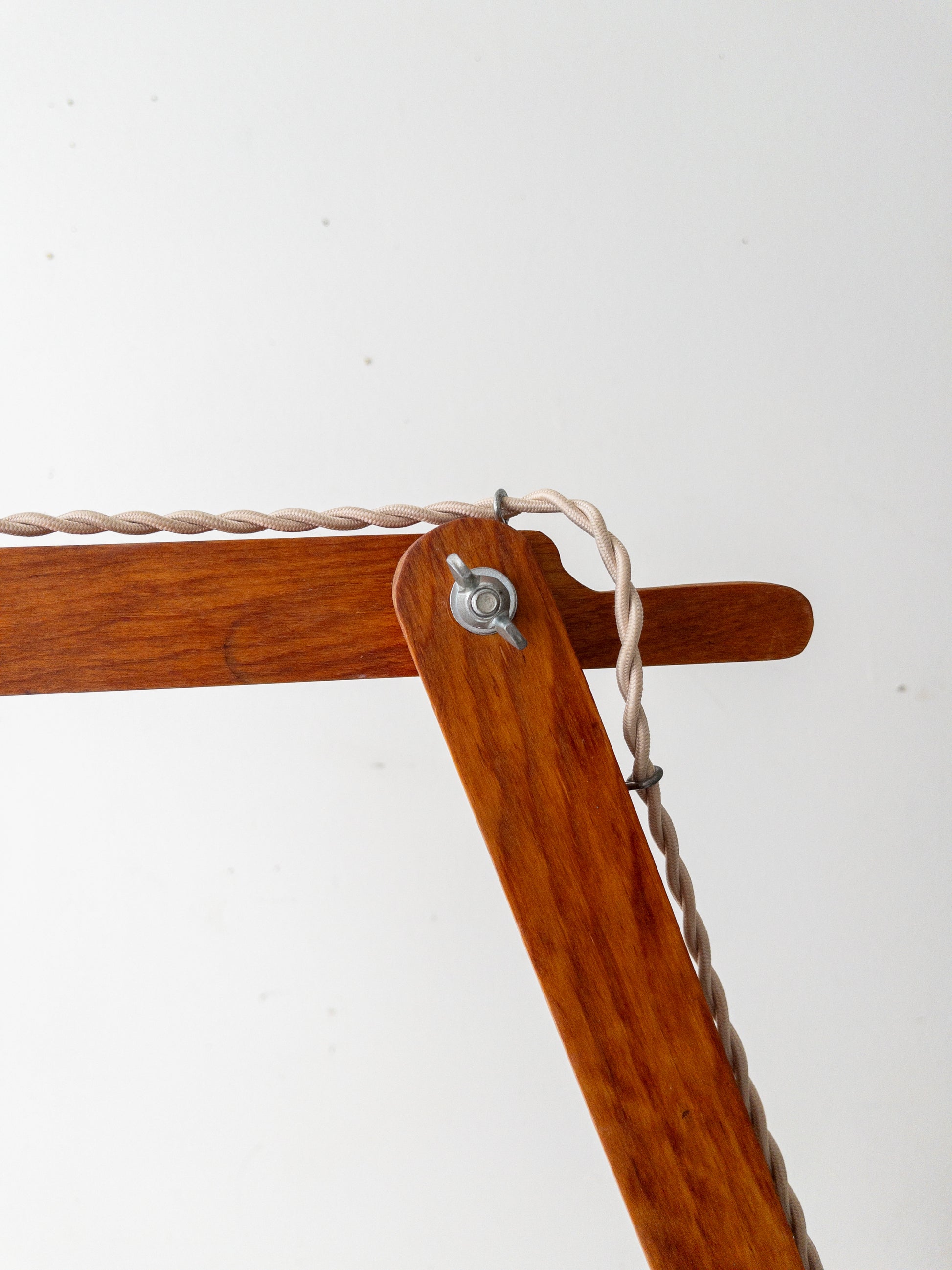 Vintage wood articulated light with a full swivel at clamp. Finished with solid brass hardware and a frosted glass shade. circa unknown, likely 70s.