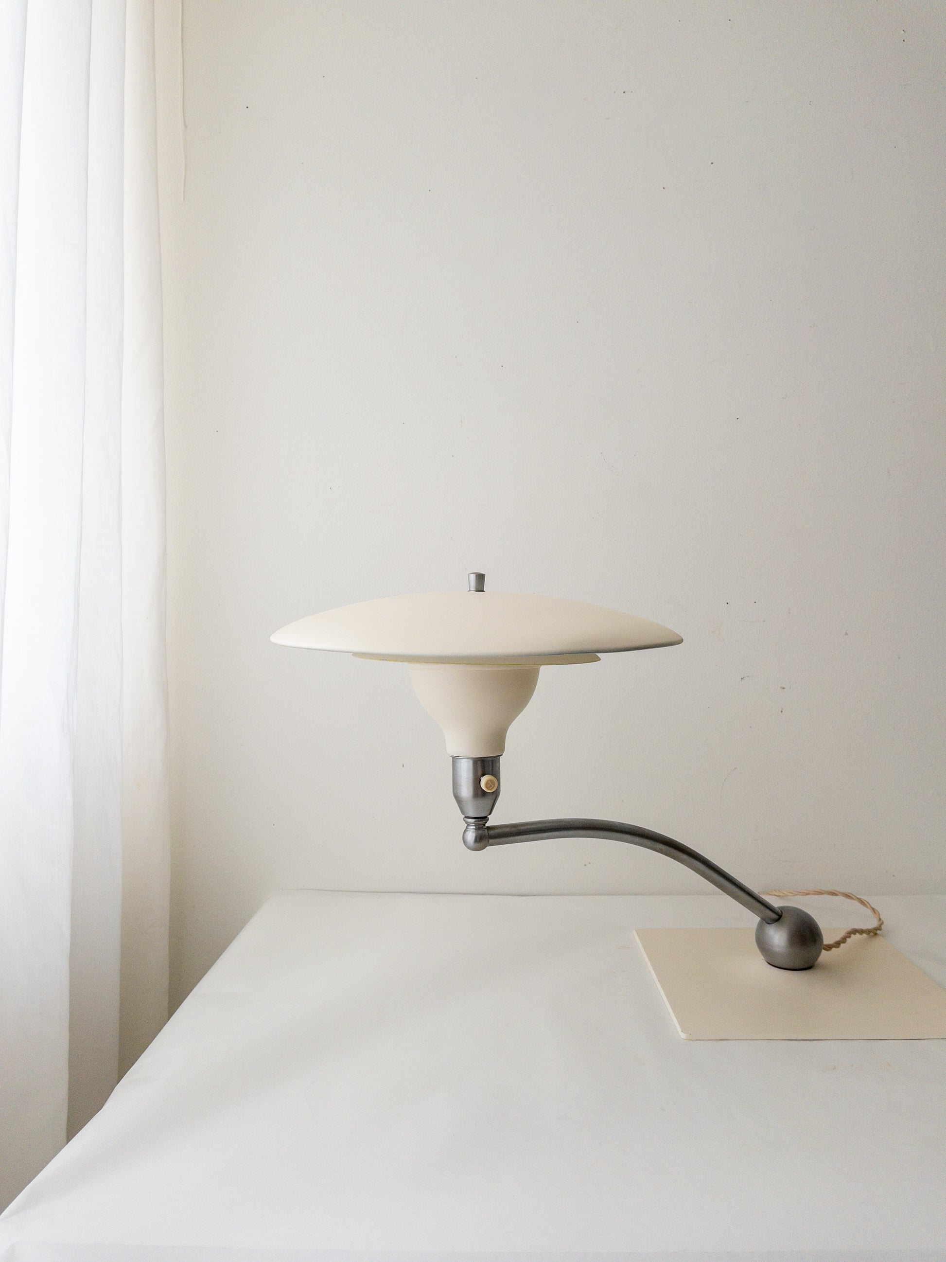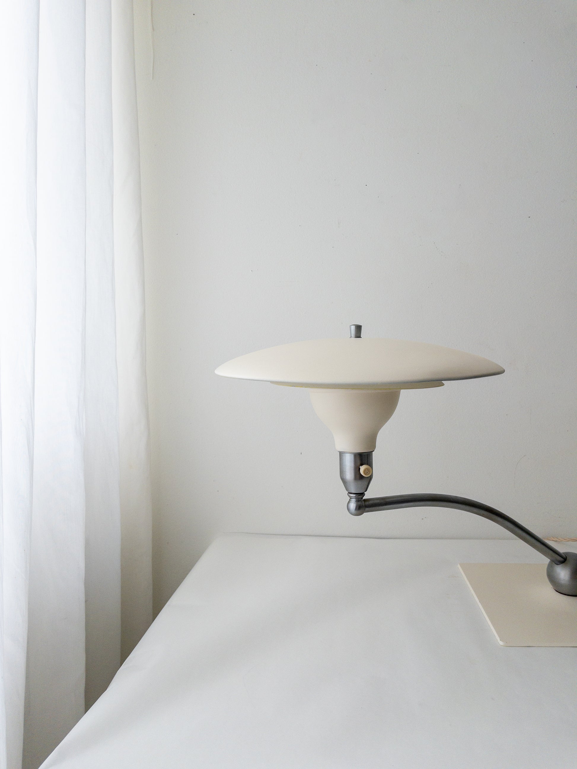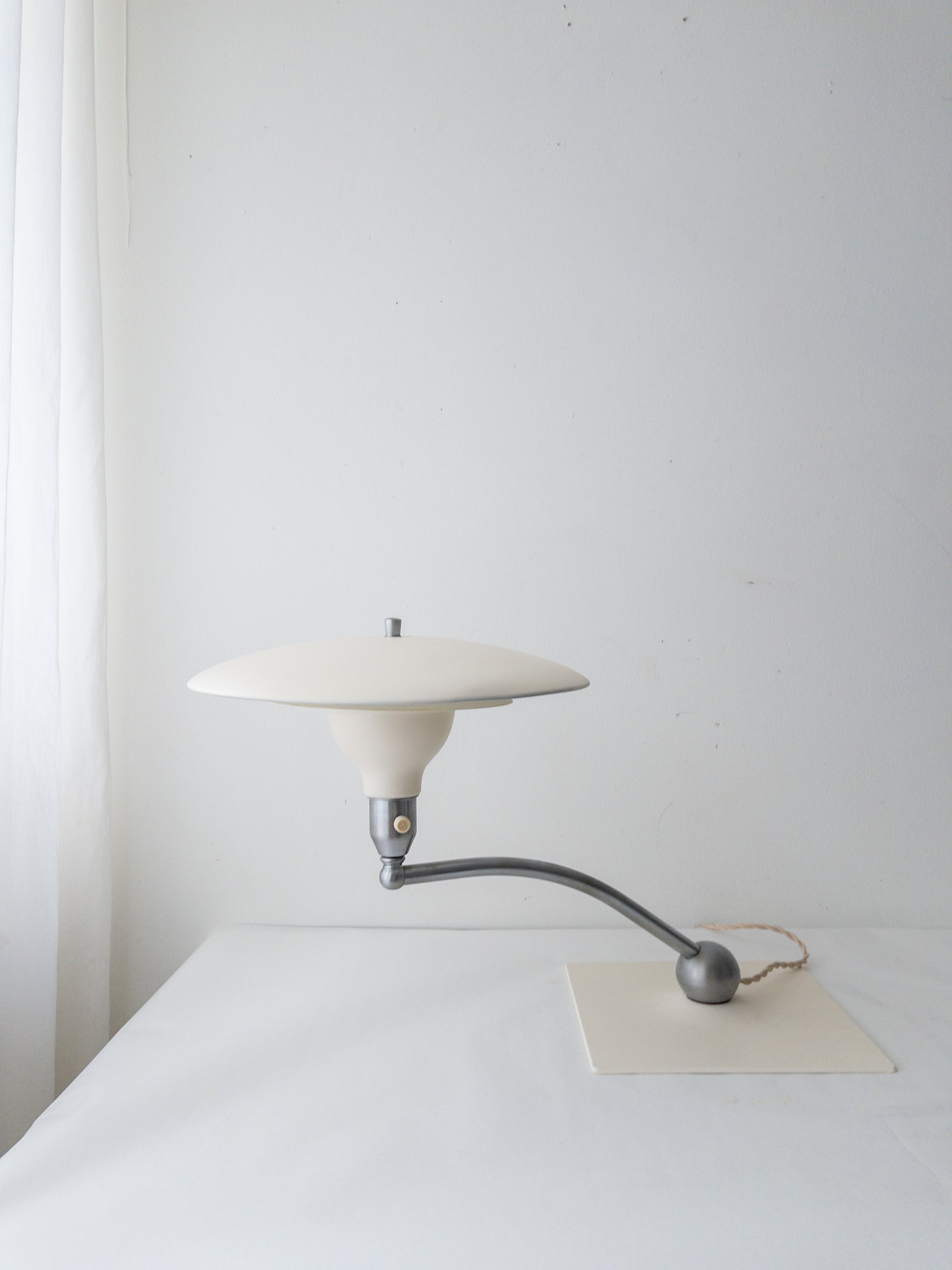 Atomic "sight light" flying saucer desk lamp. full 360 swivel arm. circa, 50s