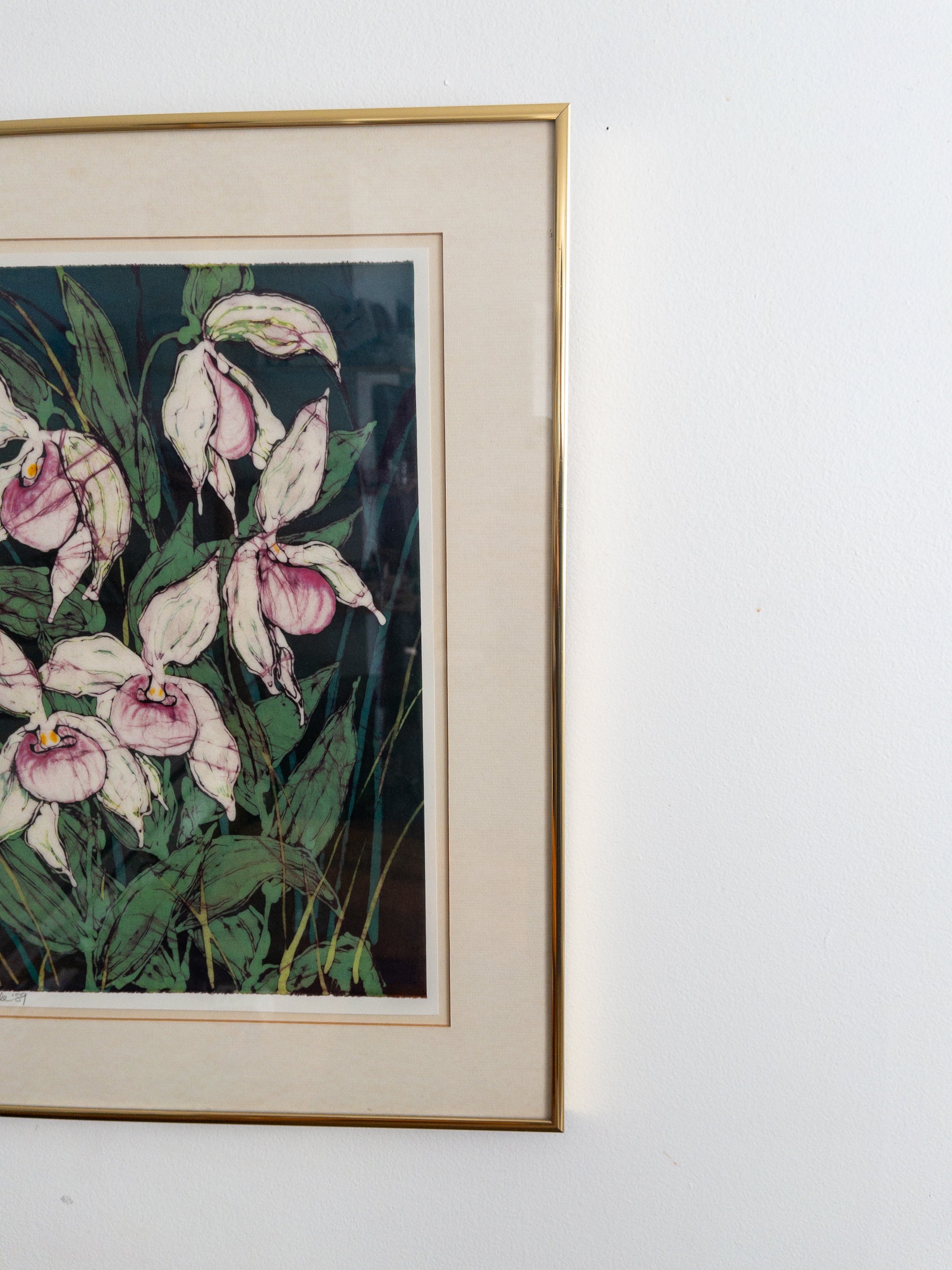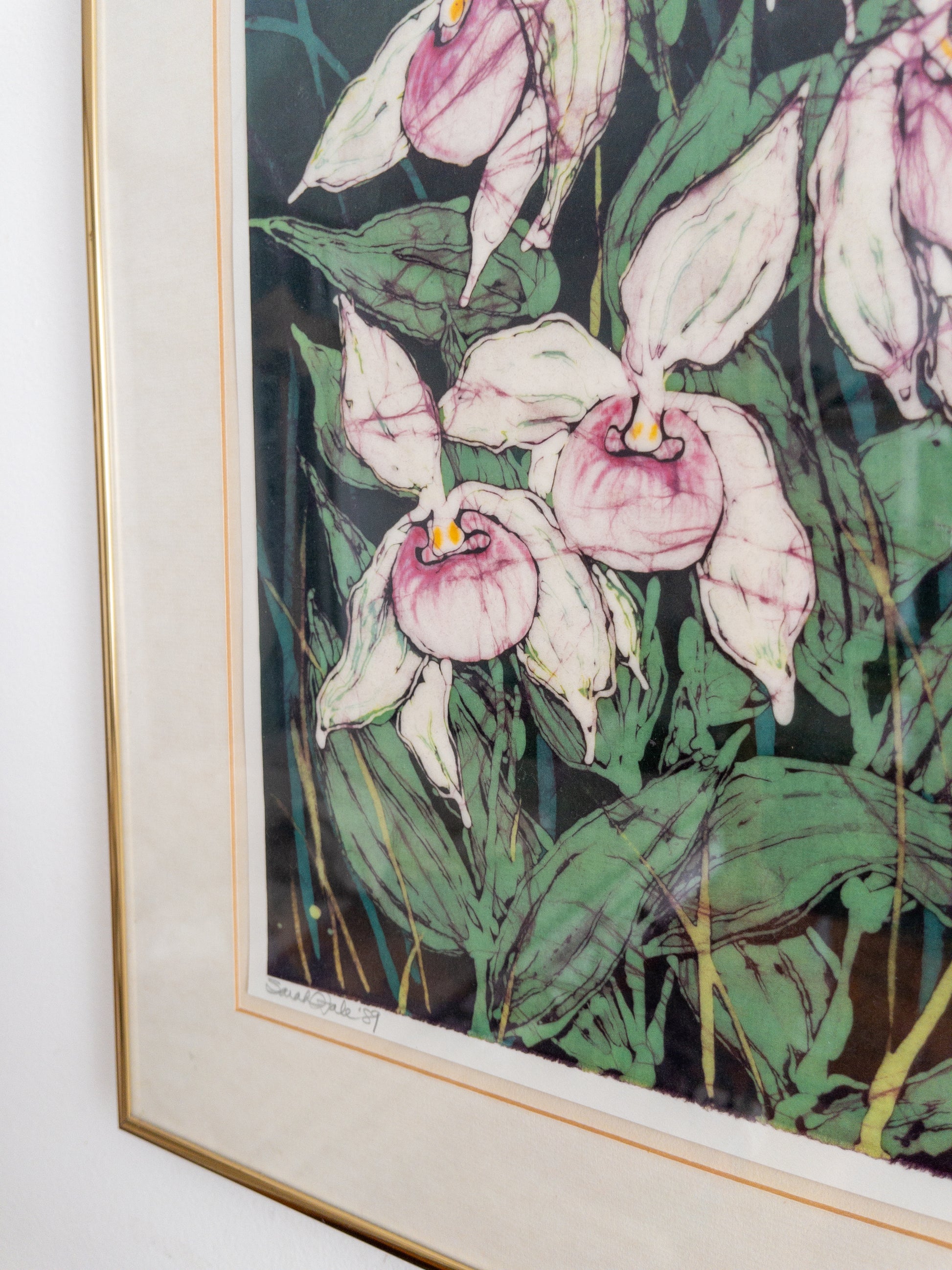 Framed vintage floral dyed fabric (batik) art of orchids signed Sarah Gale, 1989.