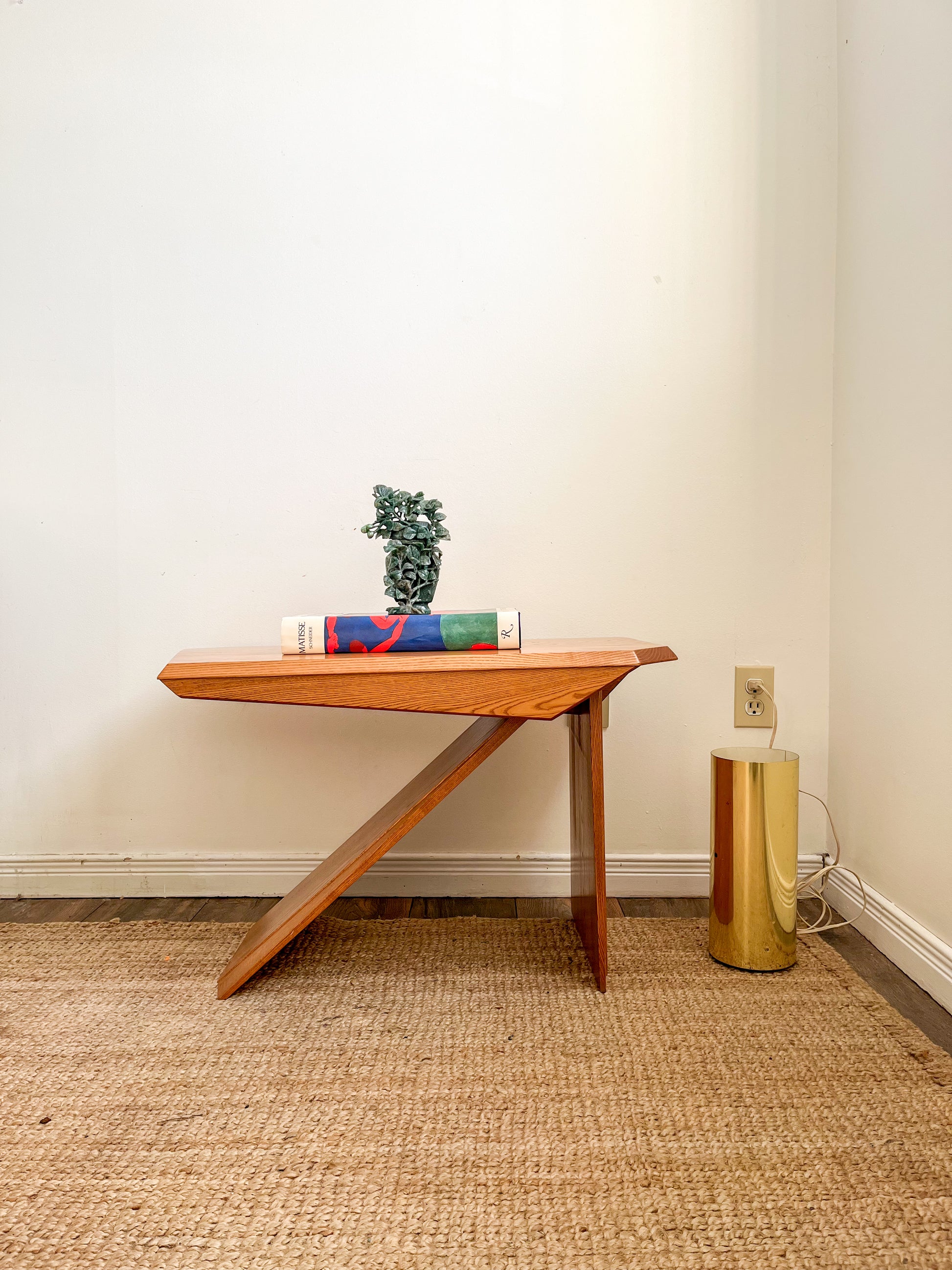 Original solid oak cantilever table. The smaller of 2 sister tables. Can work together to create overlapping pieces or used solo. A stellar shape and solid construction. circa unknown, likely 70s or 90s.