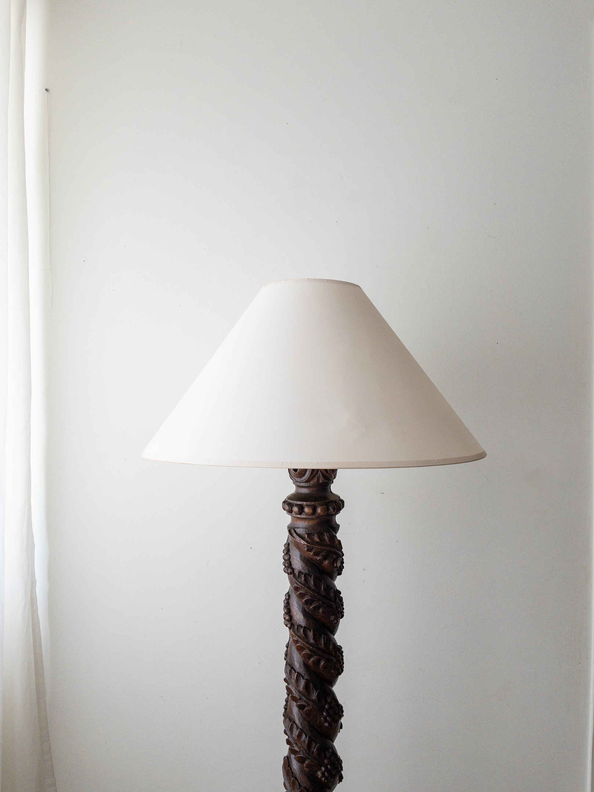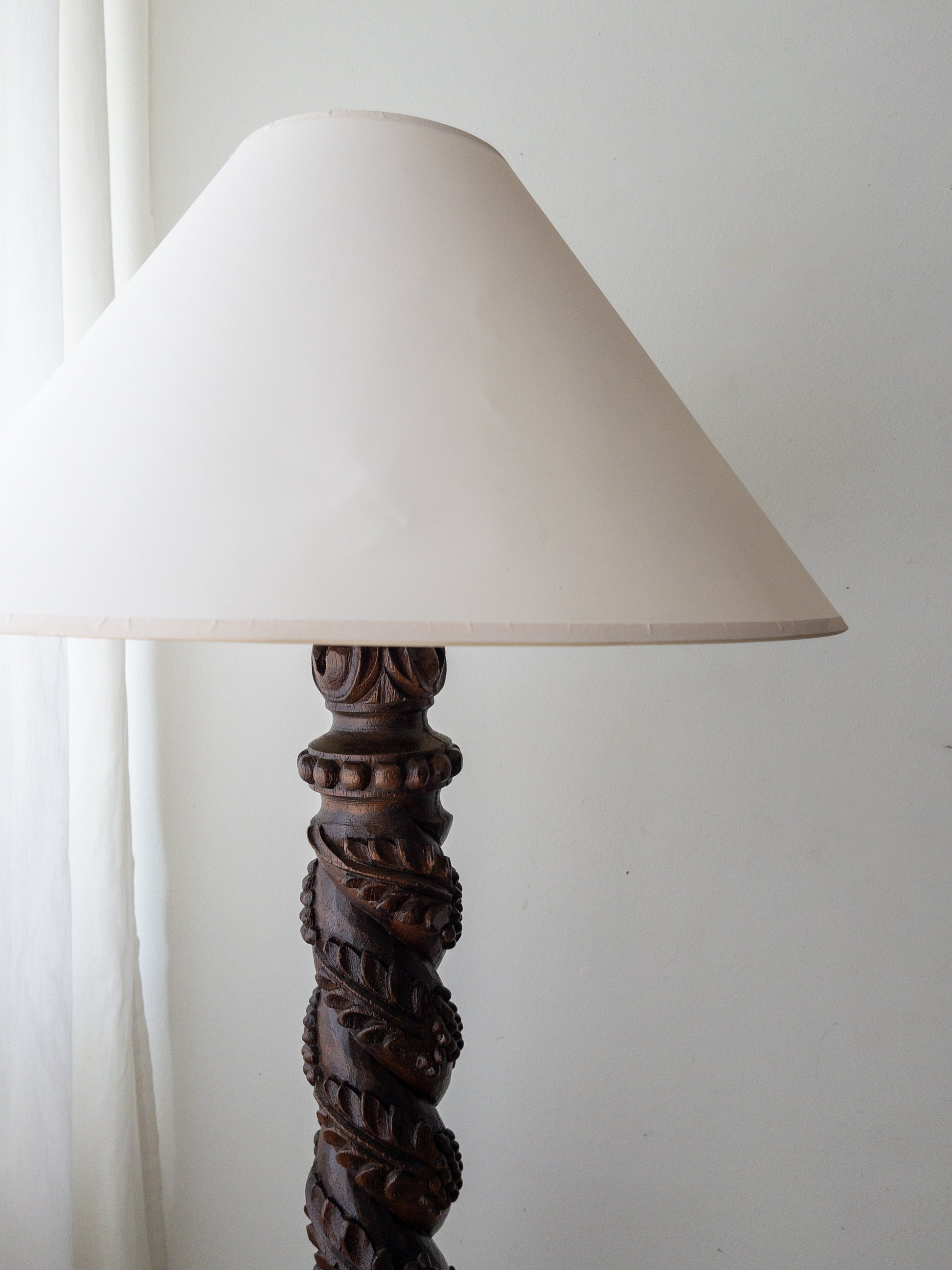 This floor lamp features detailed hand-carved craftsmanship in a rich, dark wood. circa, 60s