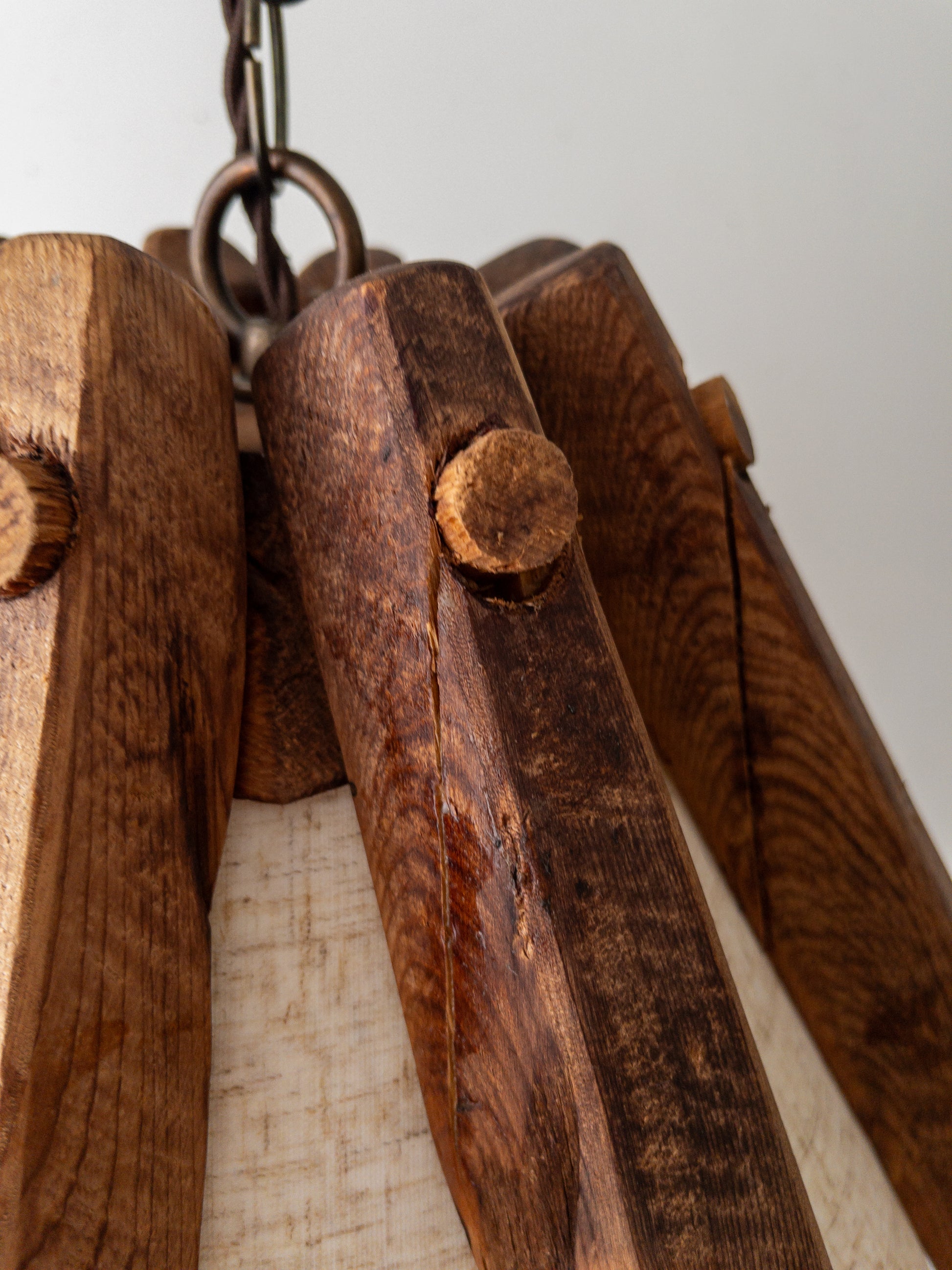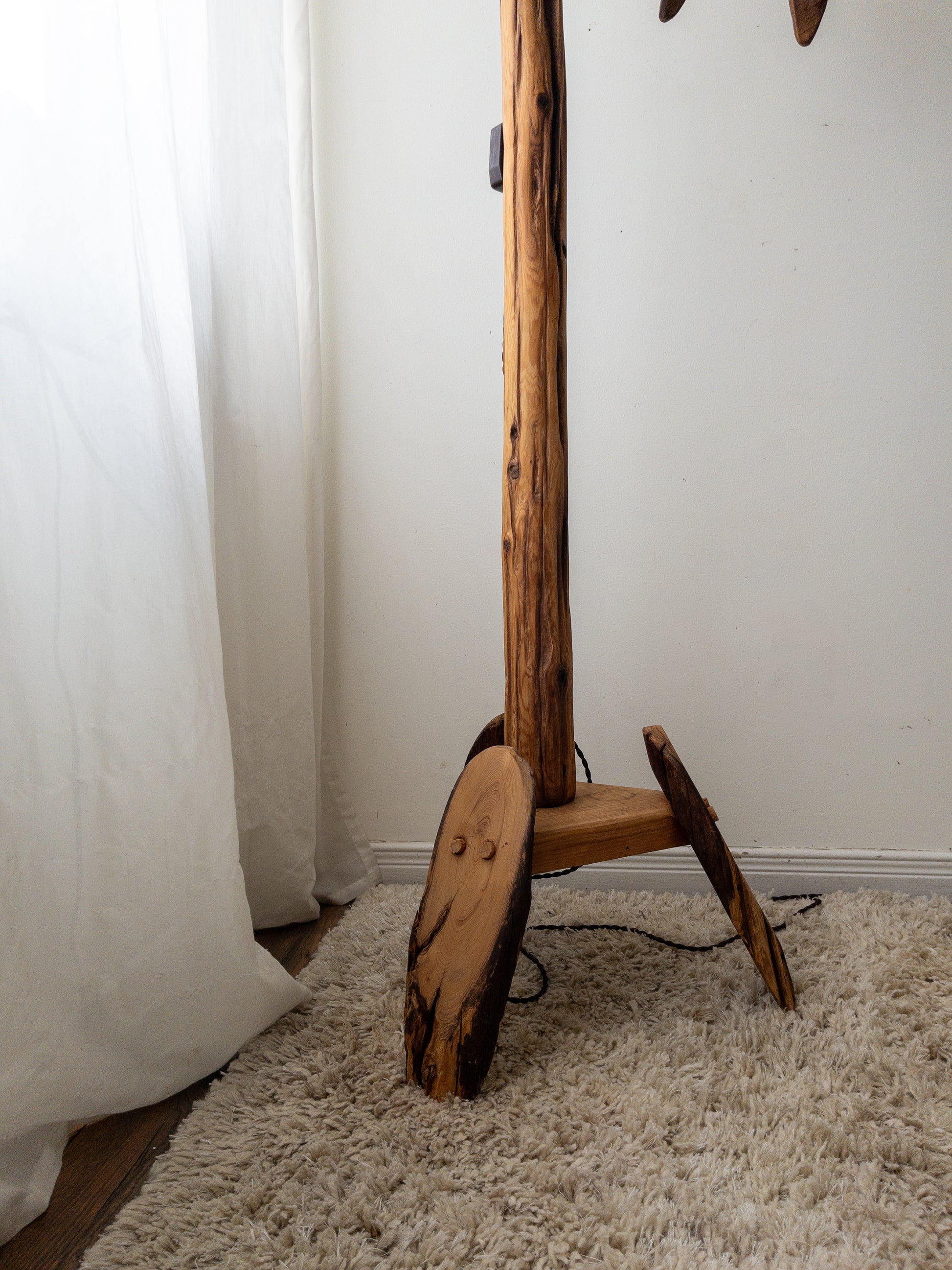 Handmade folk art cedar floor lamp with restored shades. Please note some signs of old repairs, see photos.