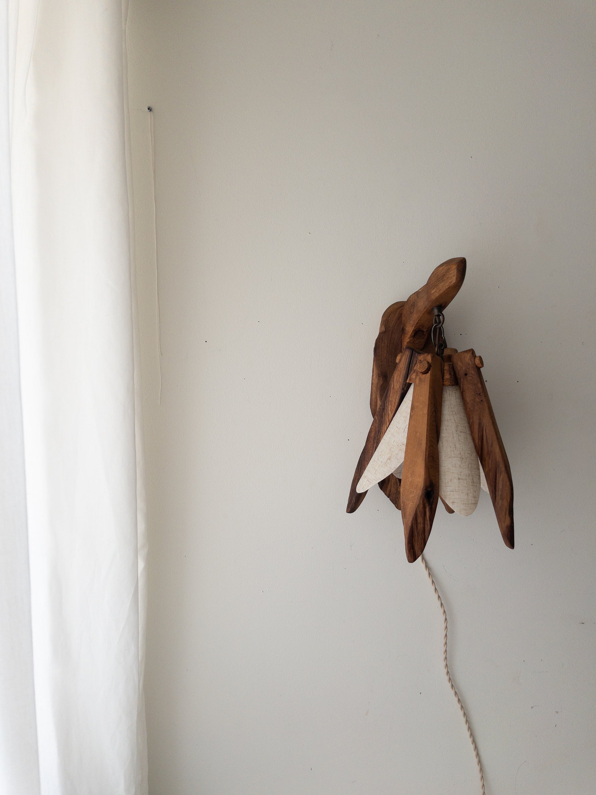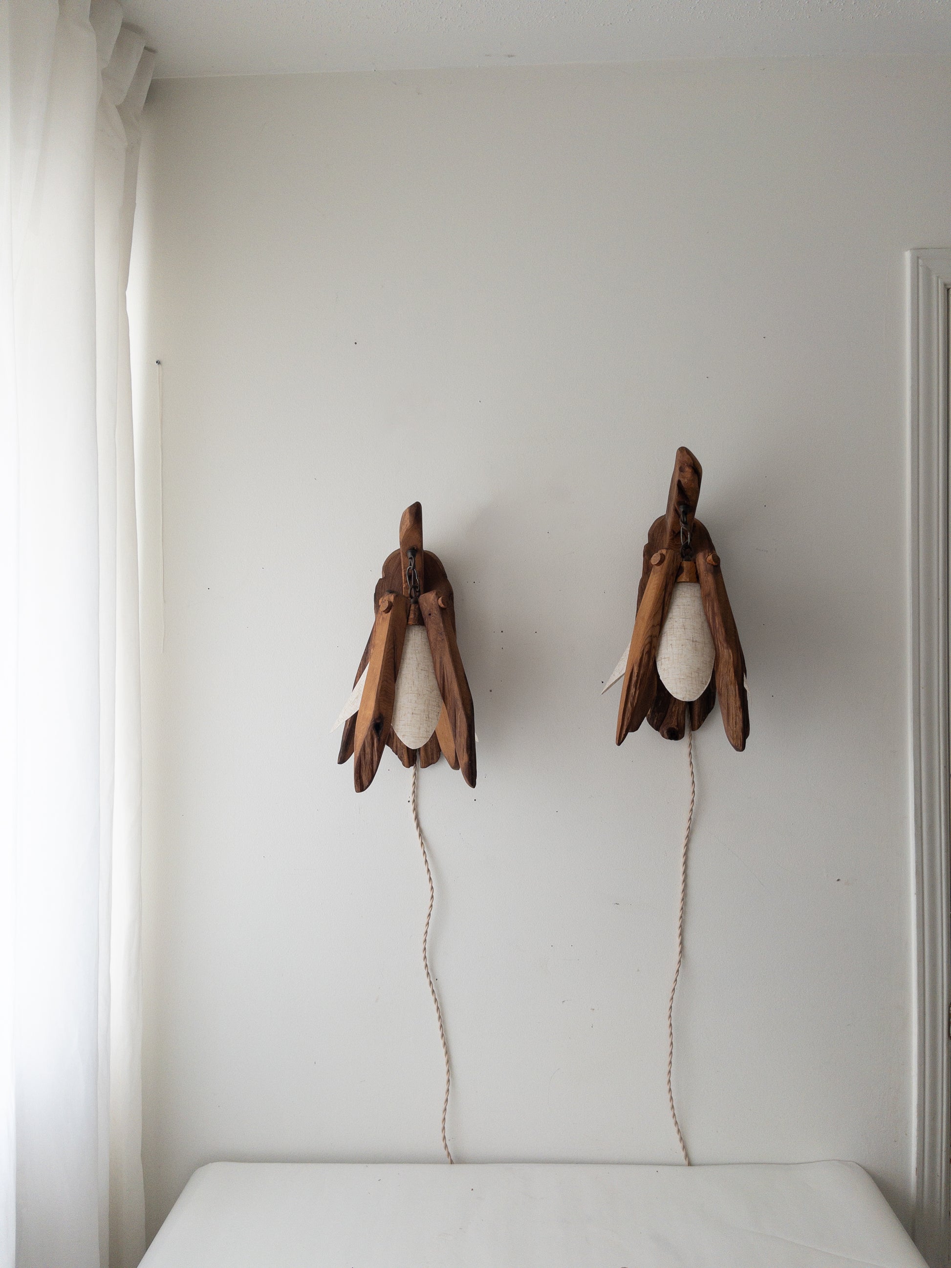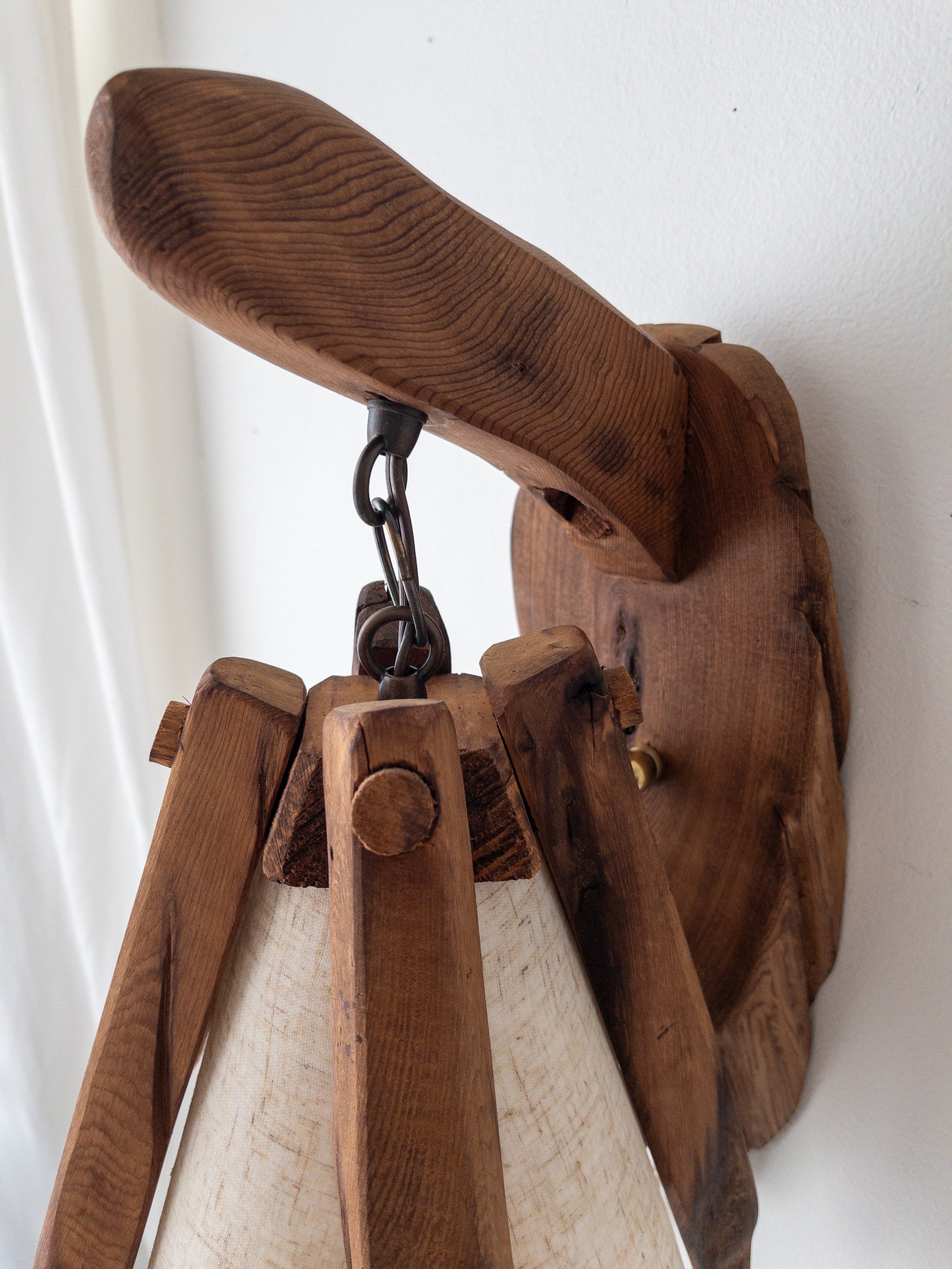 Handmade folk art cedar wall sconces with brass switch and restored shades.