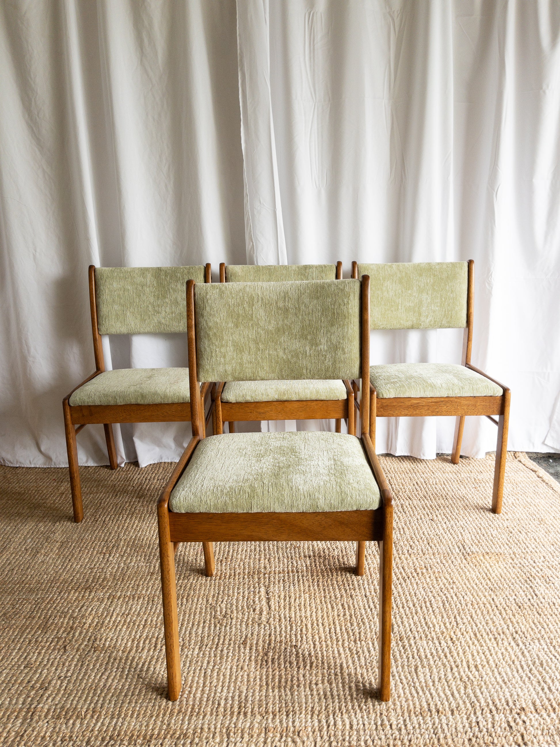 These vintage dining chairs feature medium brown solid wood and are reupholstered in a luxurious light green fabric reminiscent of celery. Each chair is stamped "Made in Malaysia," circa unknown.