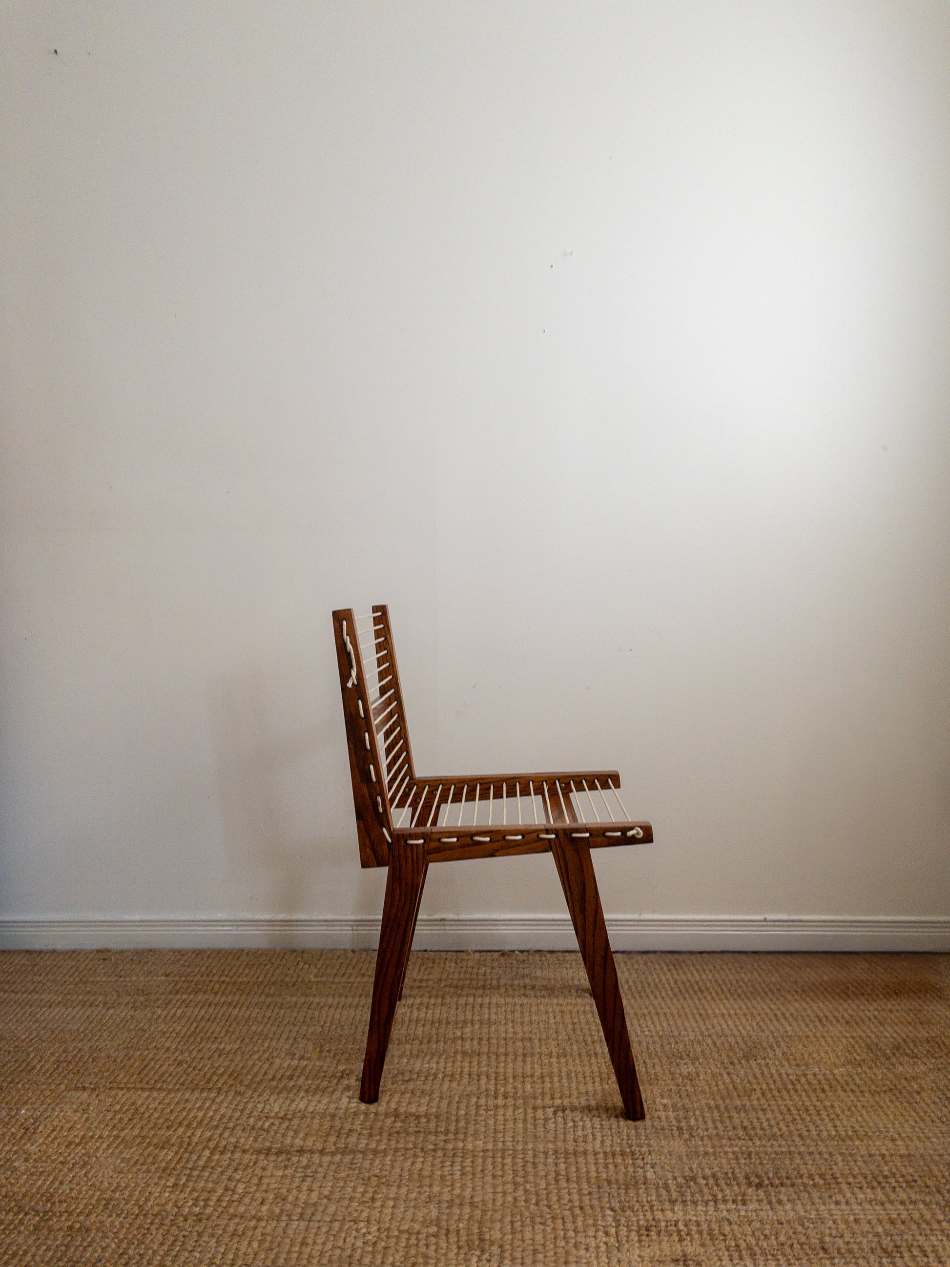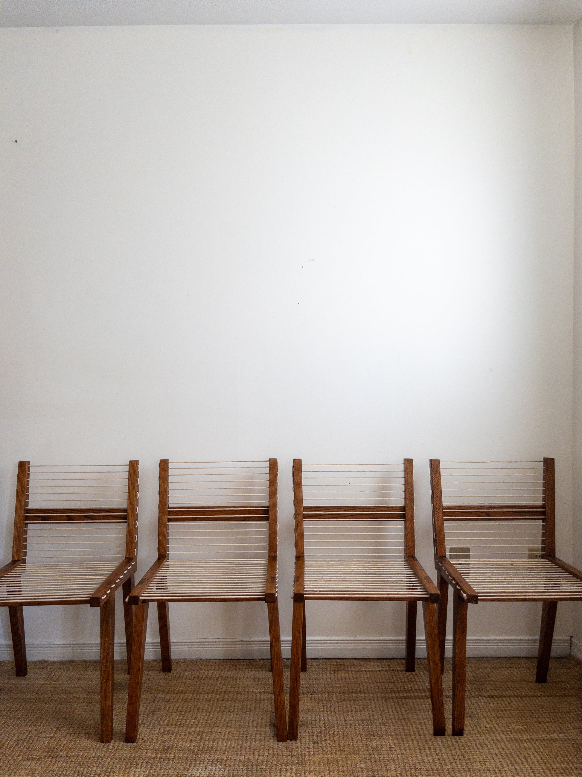 Rare mid-century corded style dining chair in a rich sold oak. These chairs are pleasantly surprising in both their function and comfort, being completely appropriate for everyday use. They were likely a handmade take on a chair design attributed to Jacques Guillion.
