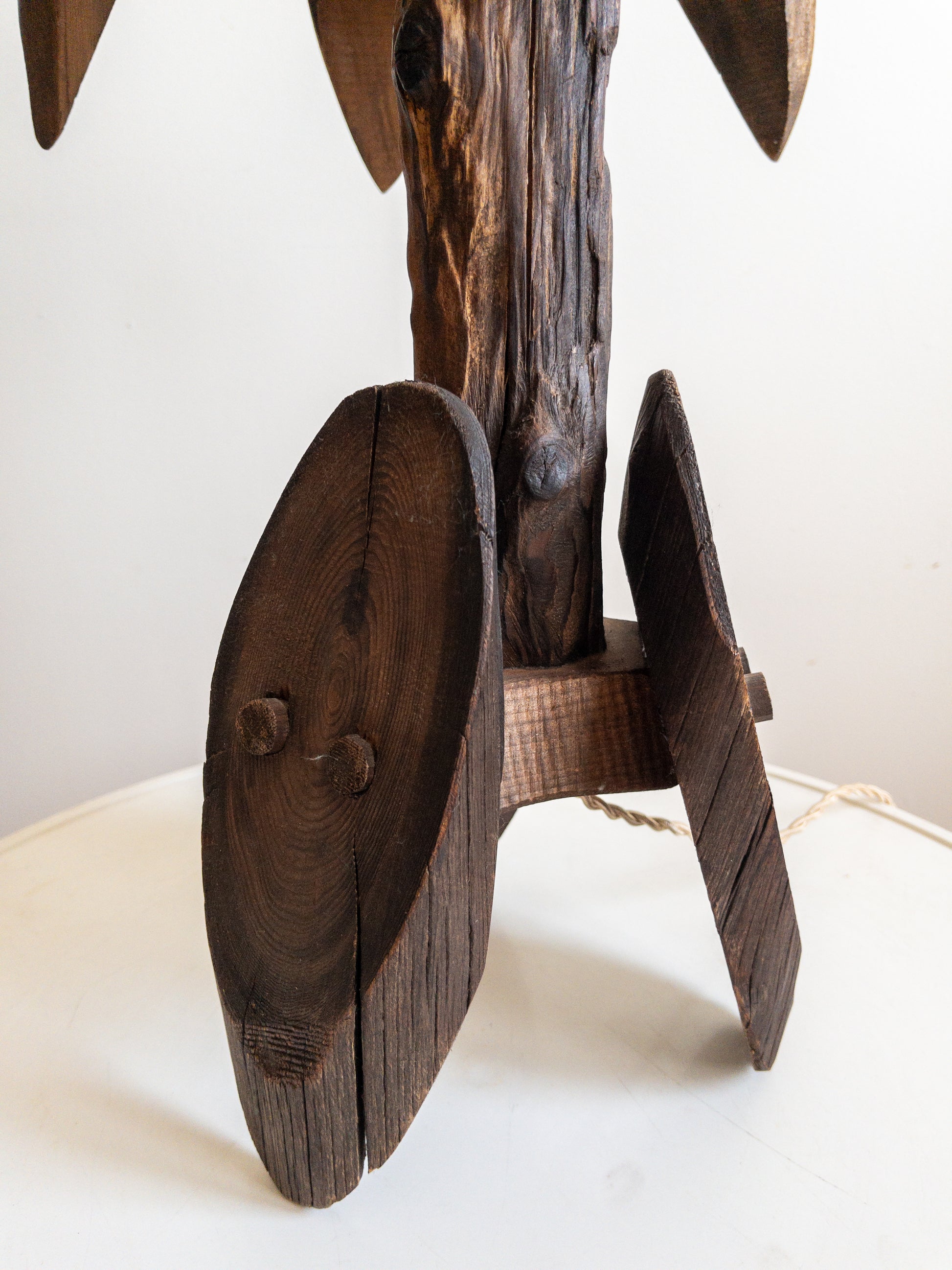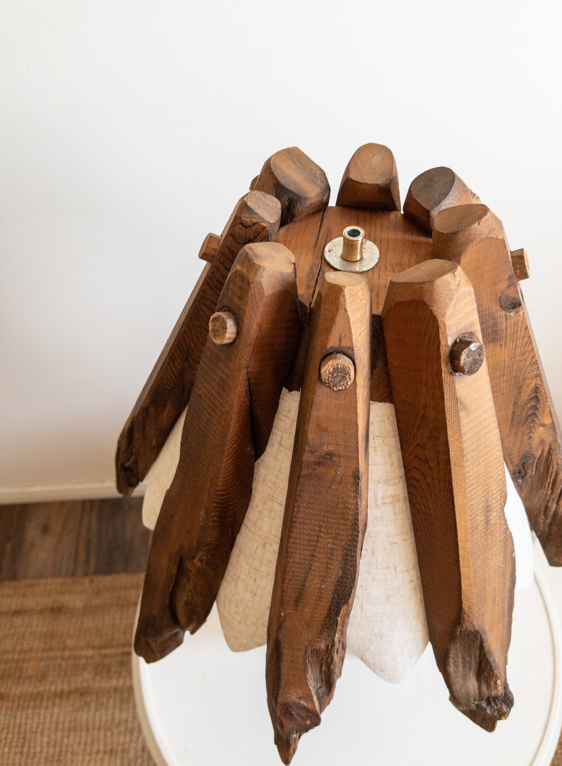 vintage handmade cedar tripod style lamps. Created with wood plugs. beautiful differentiation in the wood. Restored linen and plastic shades. circa 1970s.