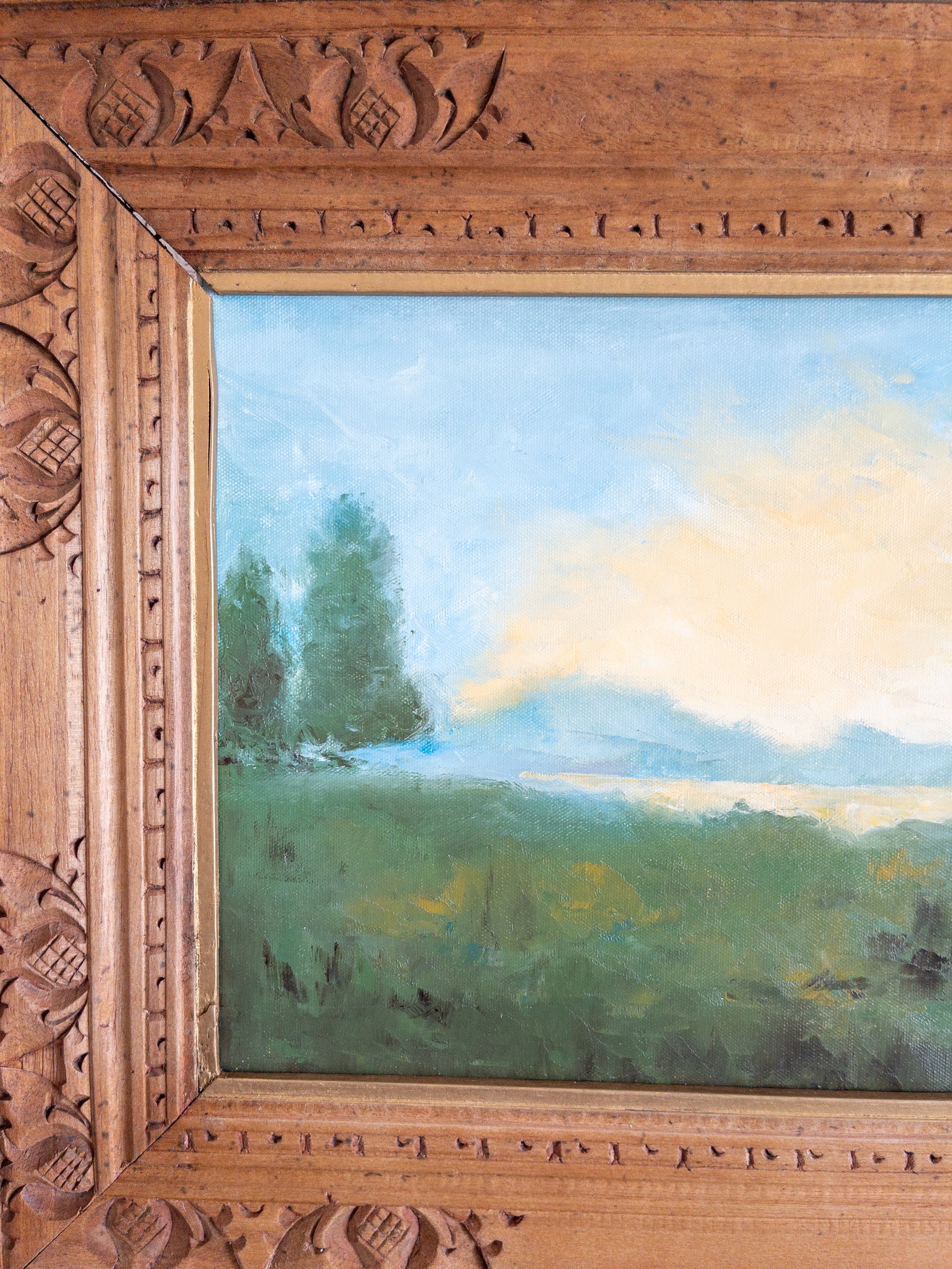 unsigned oil on board paired with a rustic vintage carved wood frame.