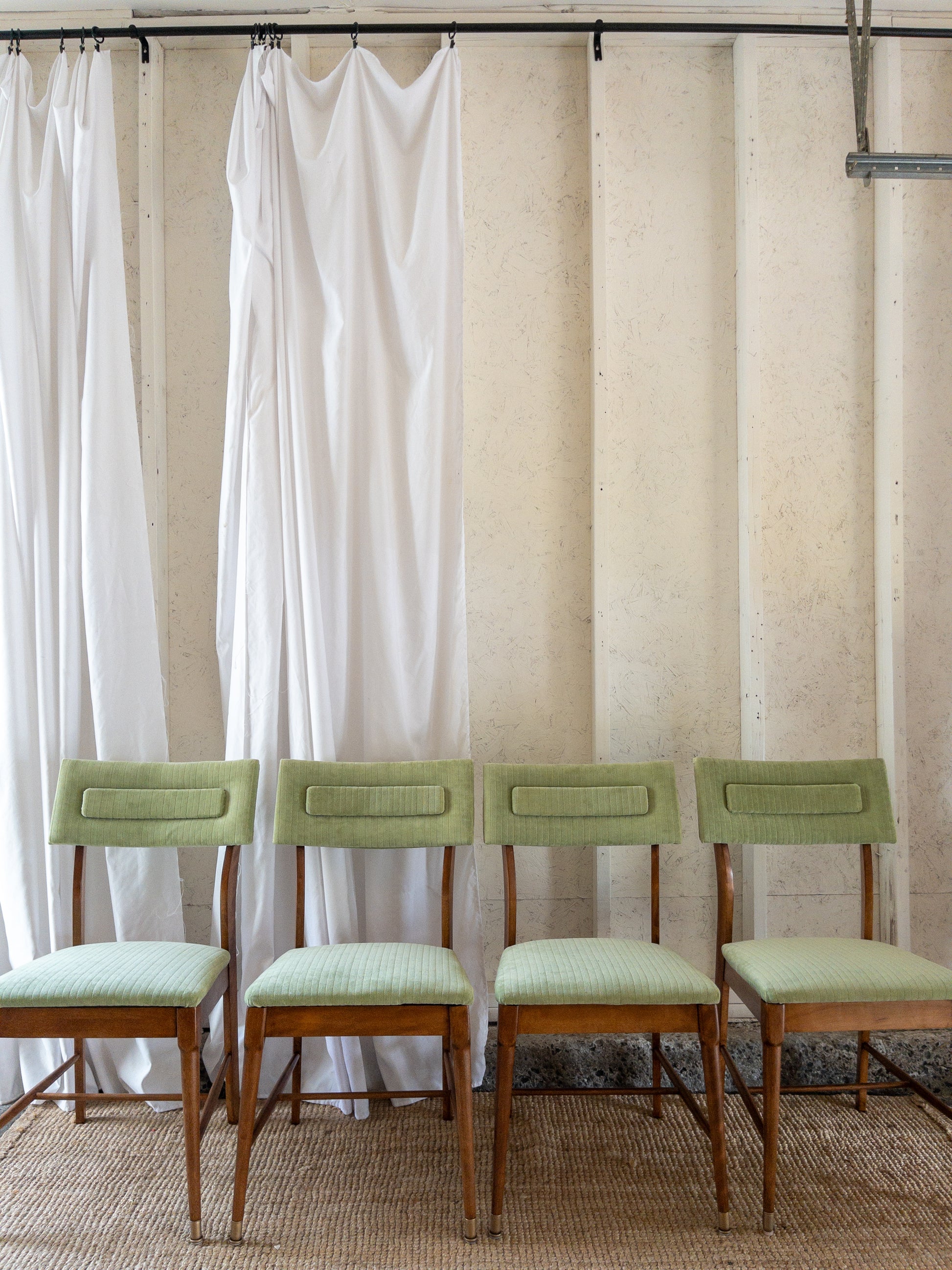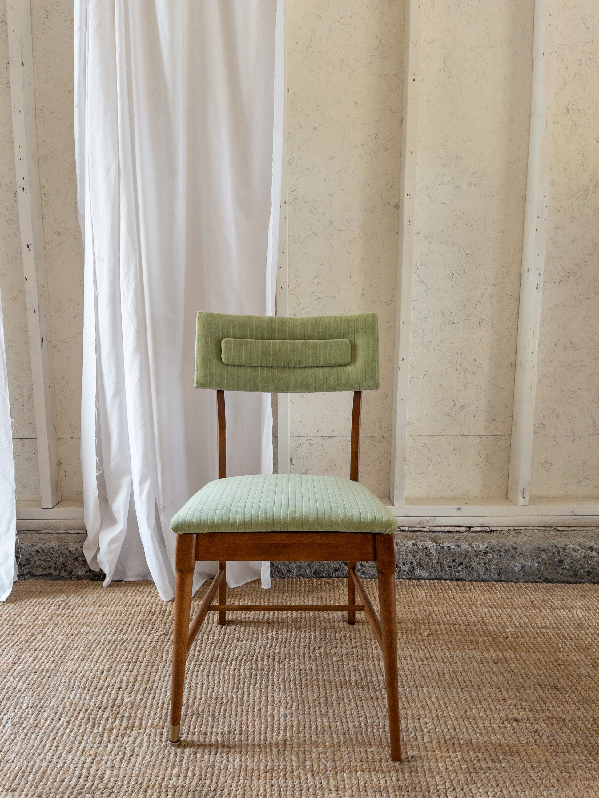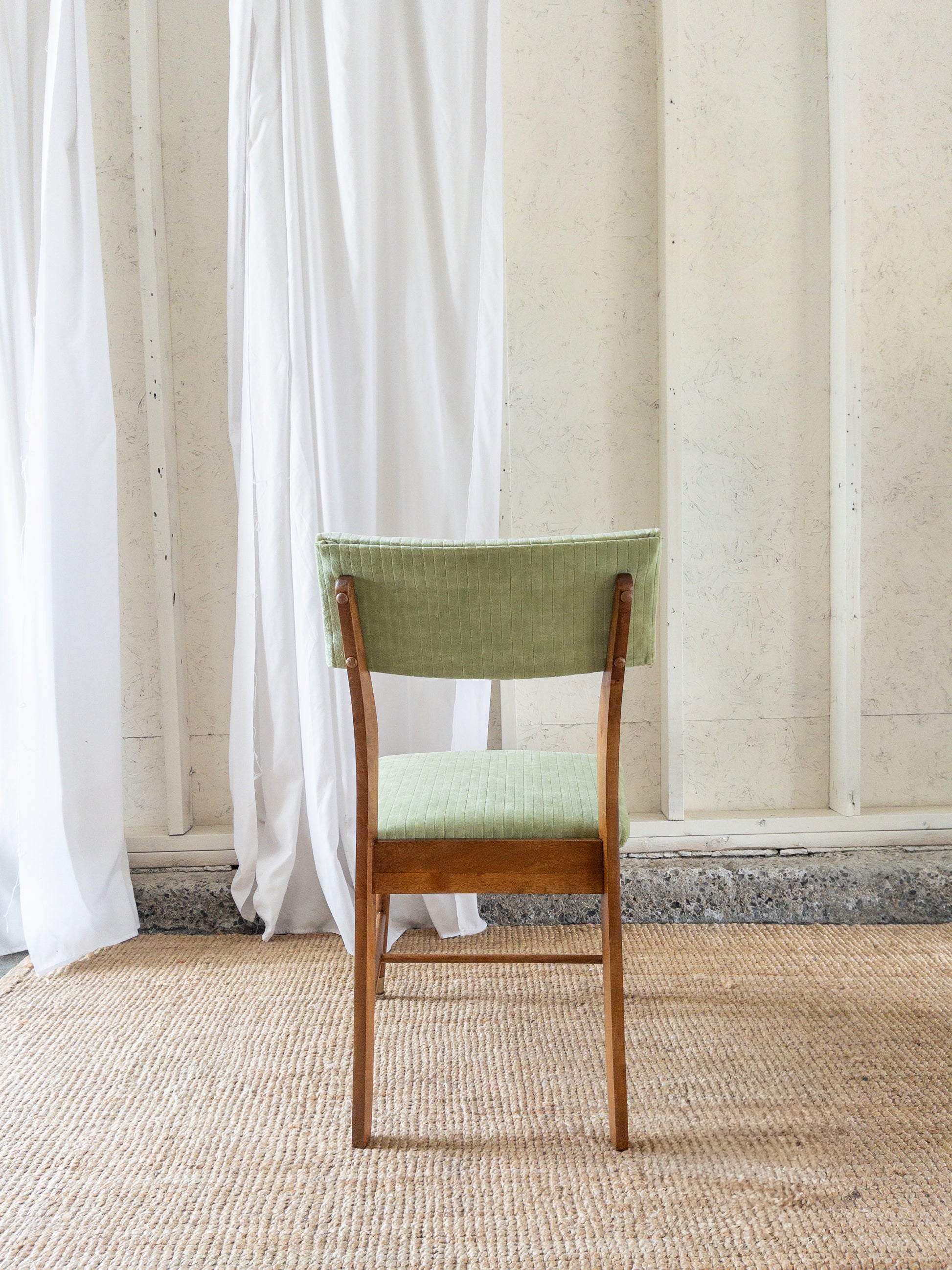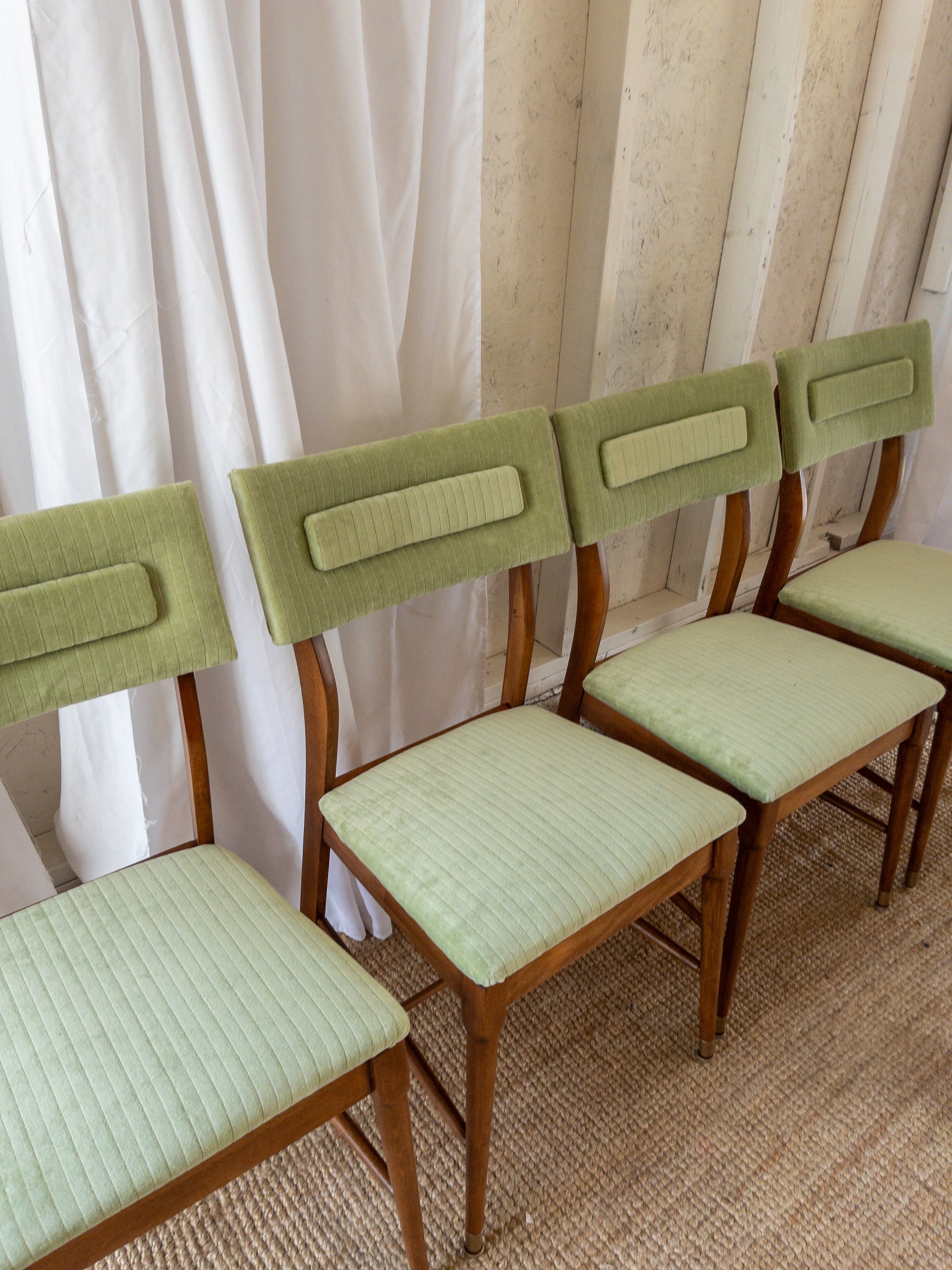 Mid century dining chairs restored in a beautiful medium brown with original capped feet. Angled back and slightly angled seat design for added comfort. Reupholster in a light green velvet corduroy.