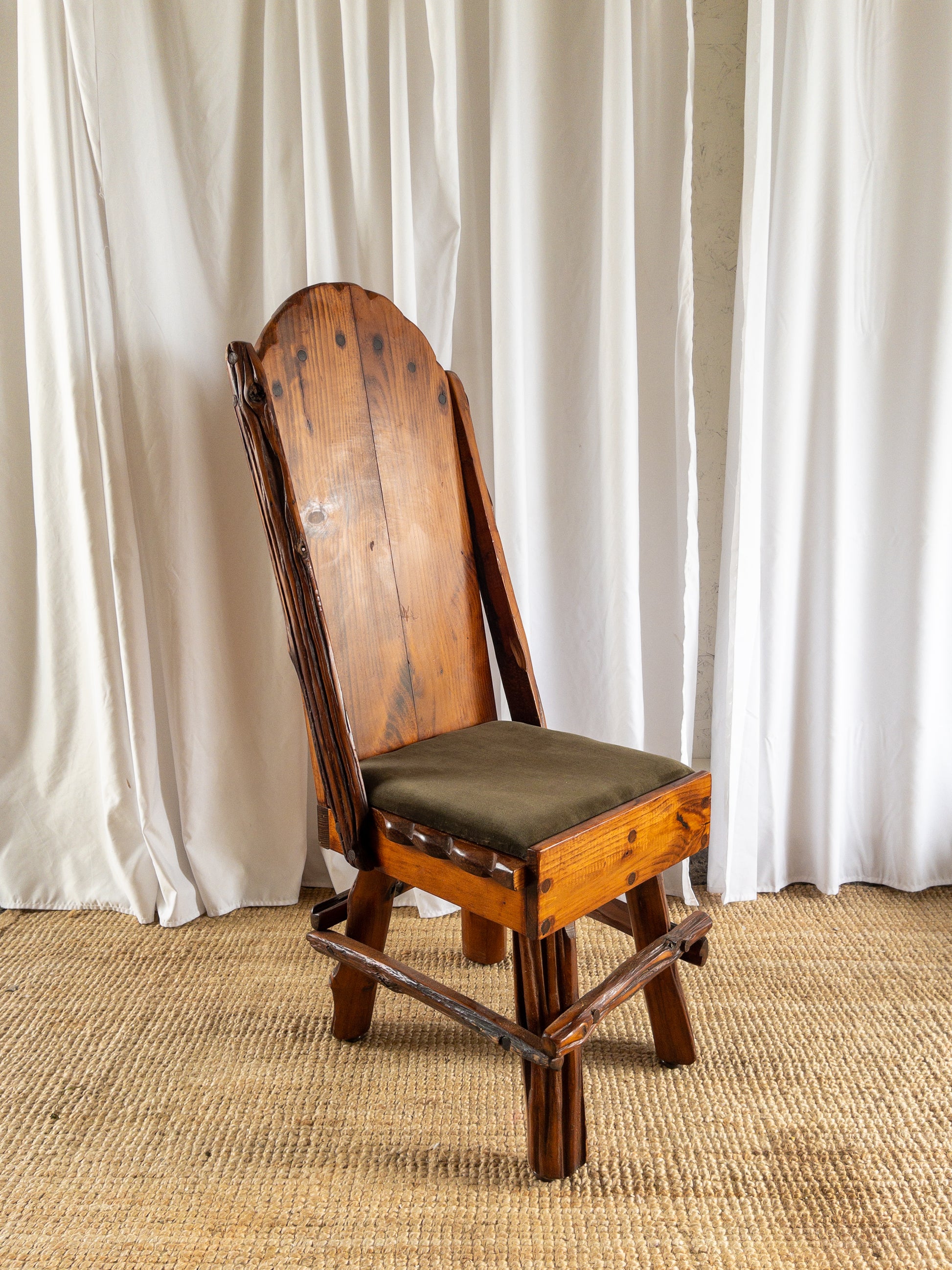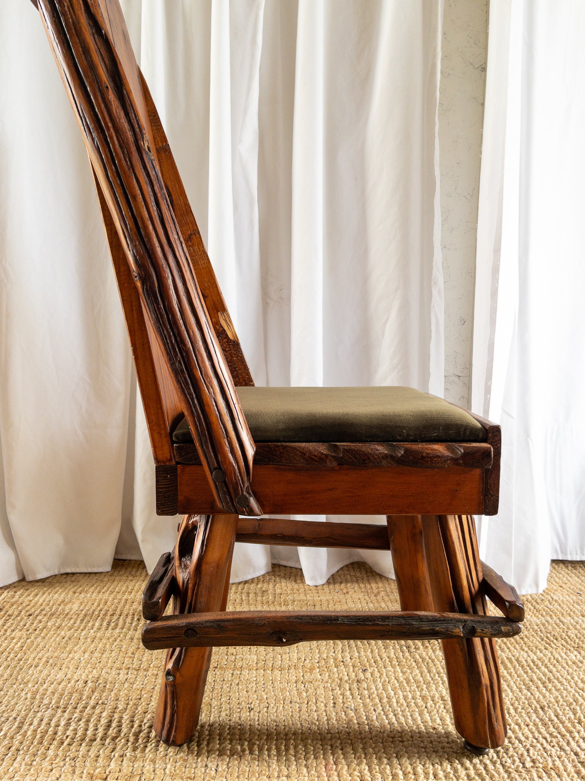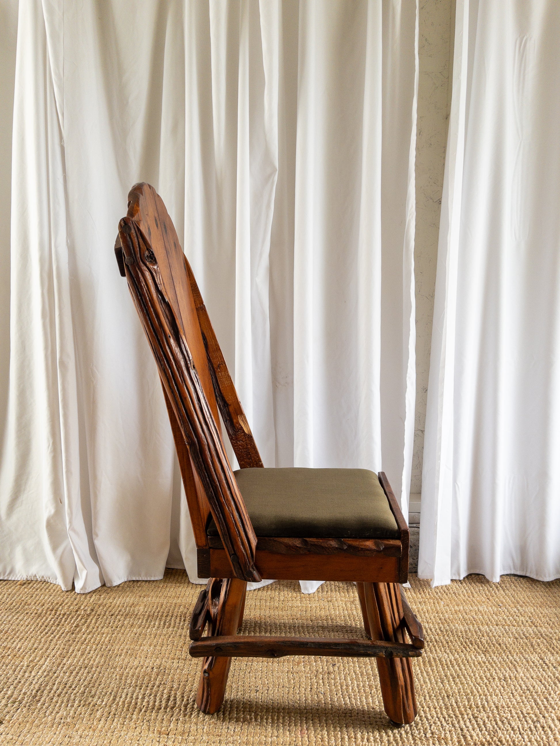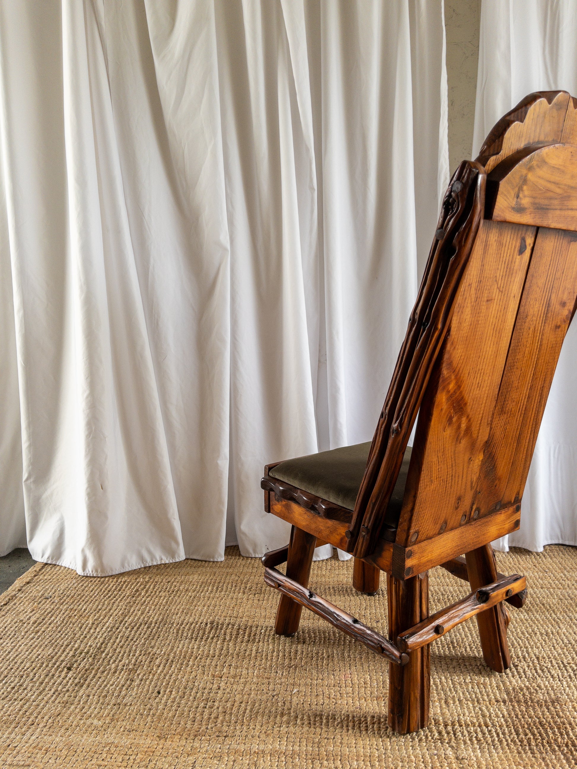 Brutalist handmade wood dining set. This sculptural masterpiece is made from sturdy, hard wood for long-lasting durability and features organic wood legs and details, finished with a removable velvet cushion. The only one of its kind, this dining set will elevate your dining experience to a whole new level. Custom made, circa 70s-80s