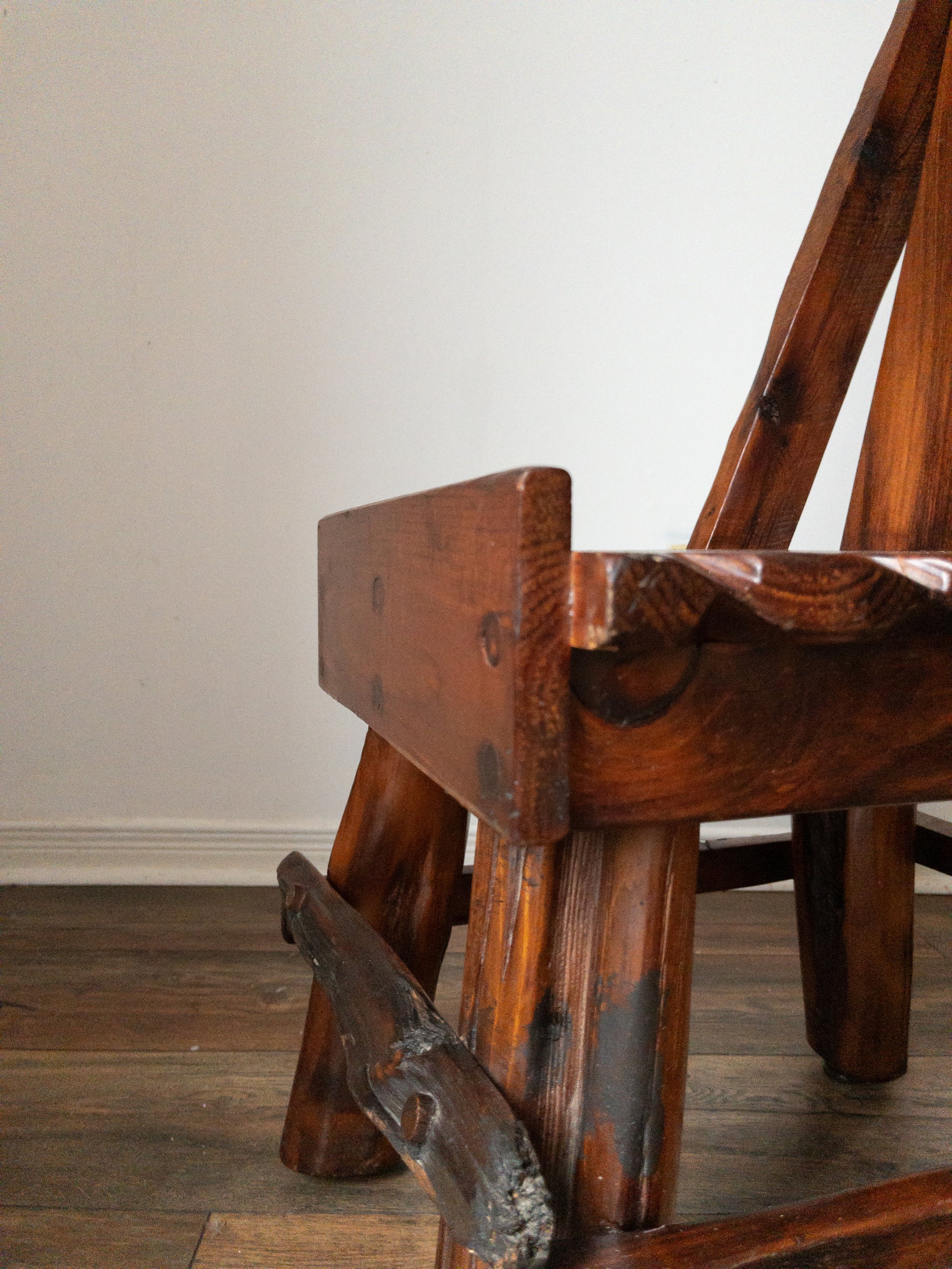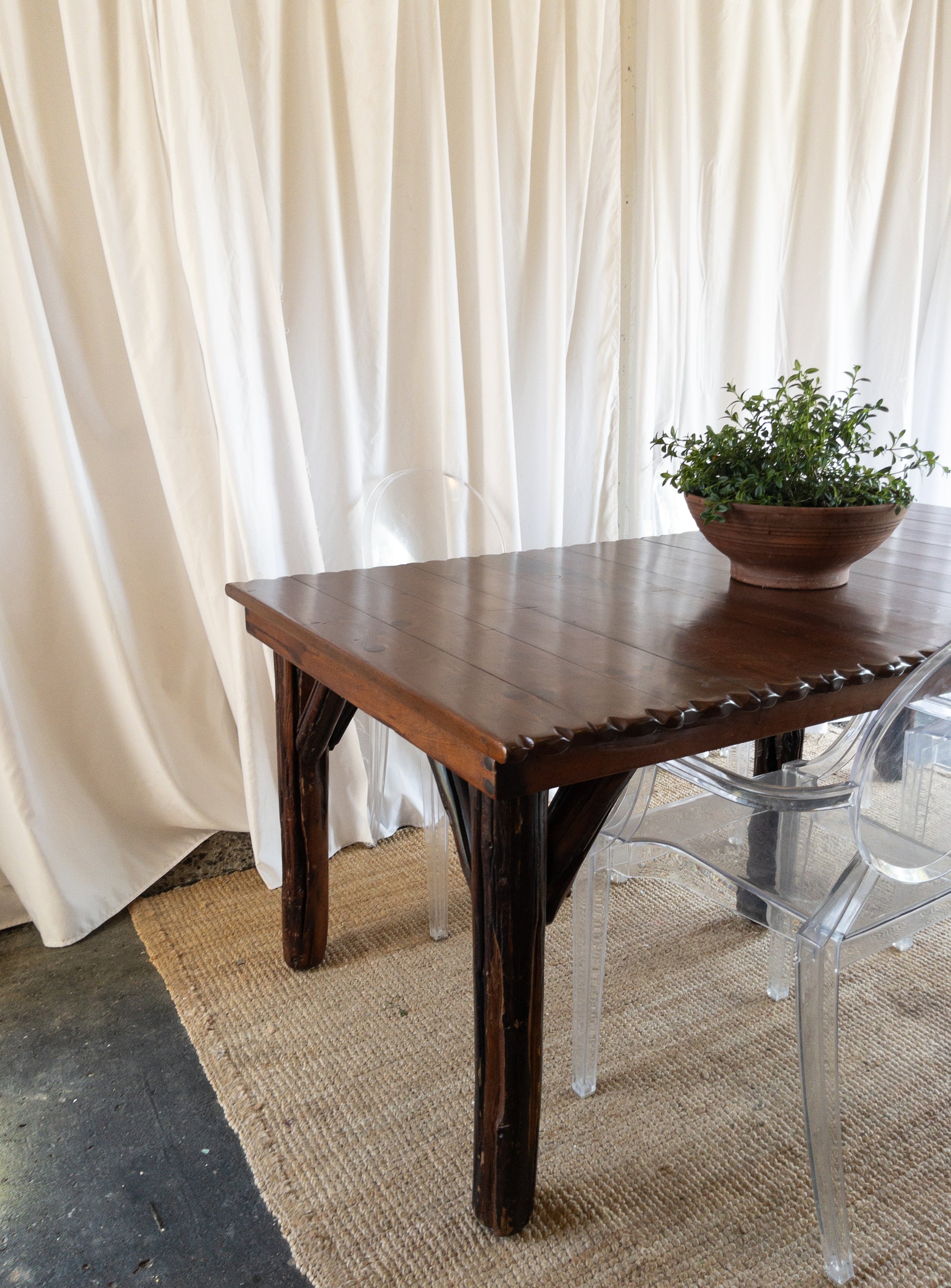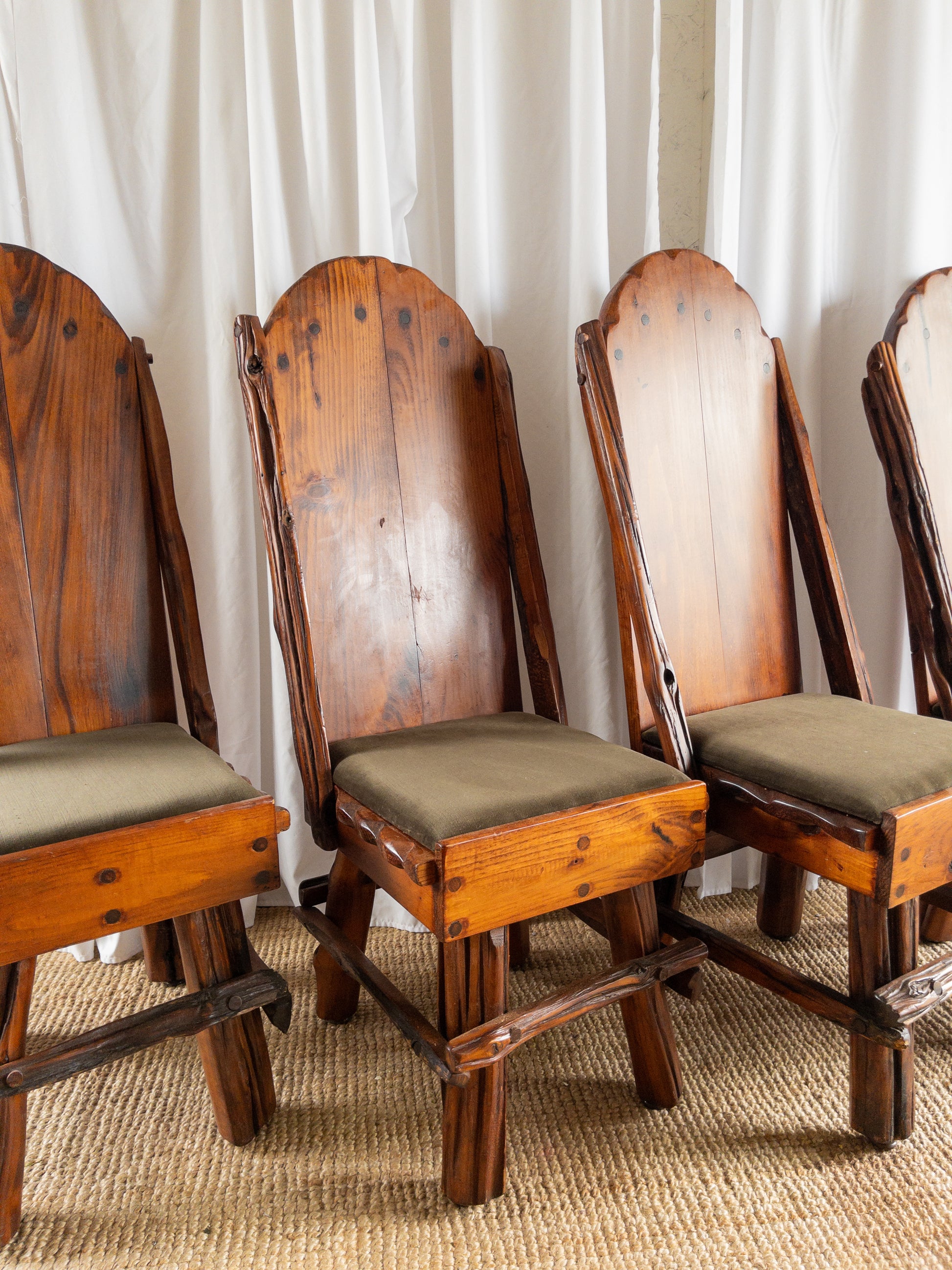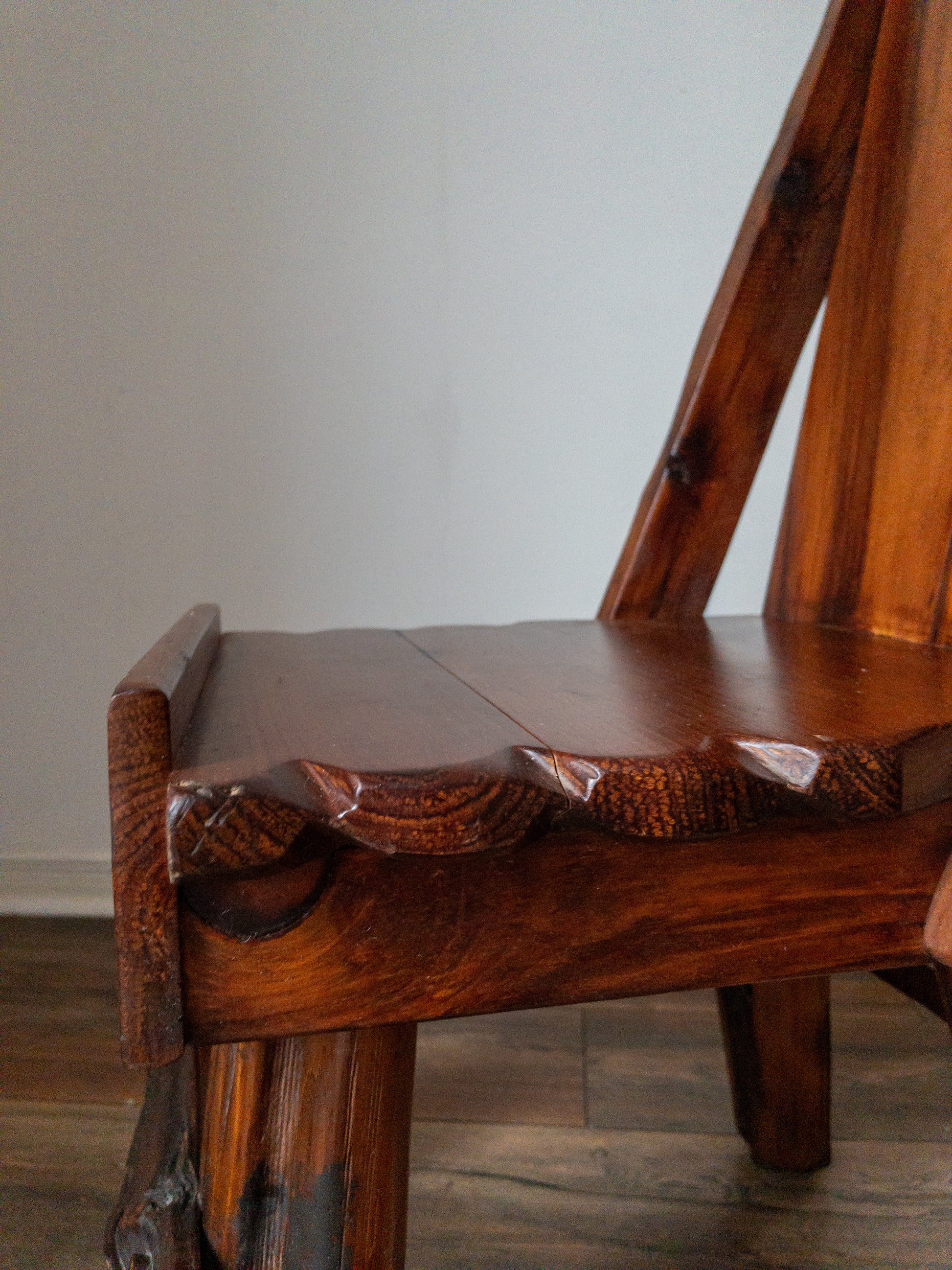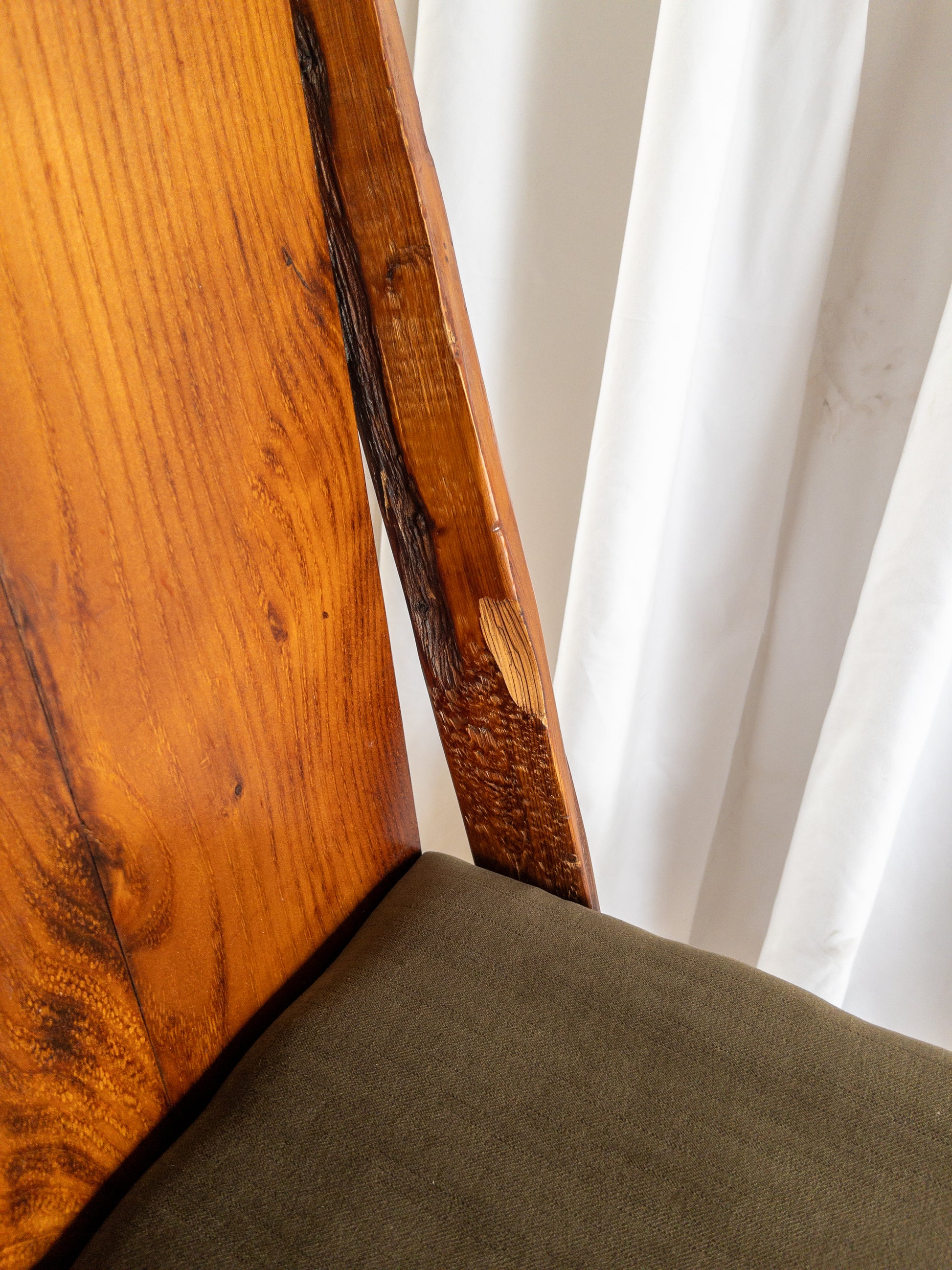 Brutalist handmade wood dining set. This sculptural masterpiece is made from sturdy, hard wood for long-lasting durability and features organic wood legs and details, finished with a removable velvet cushion. The only one of its kind, this dining set will elevate your dining experience to a whole new level. Custom made, circa 70s-80s