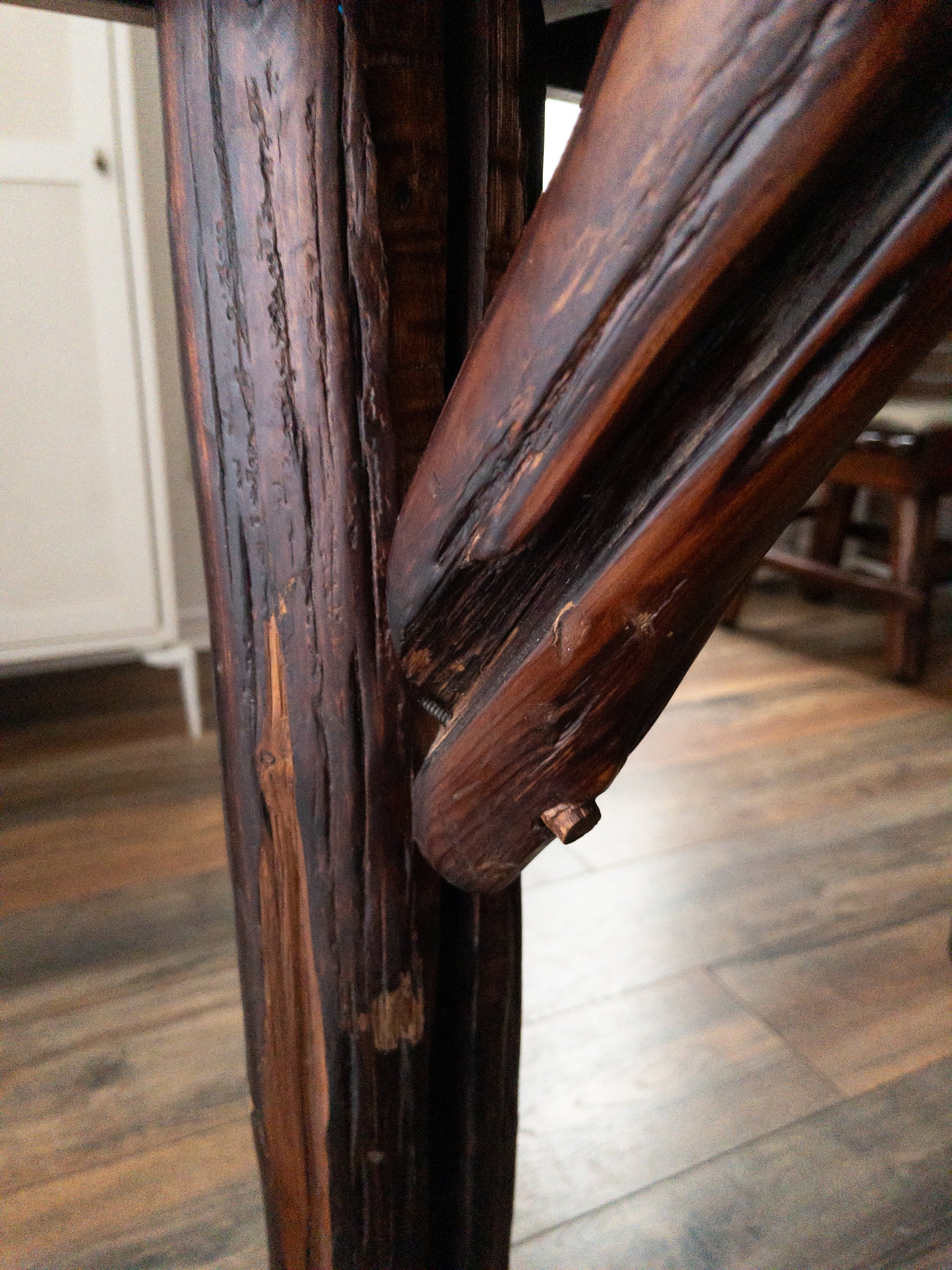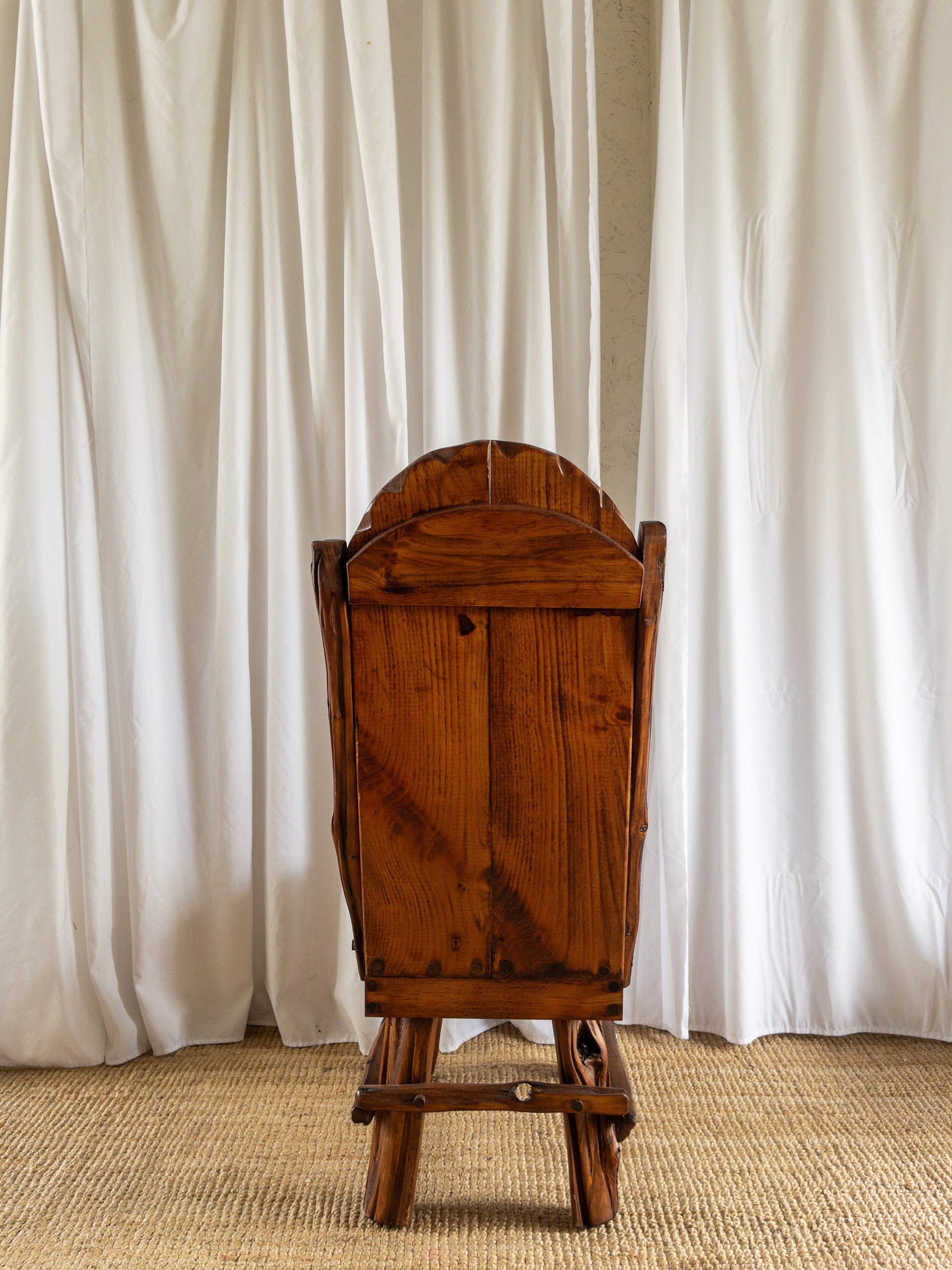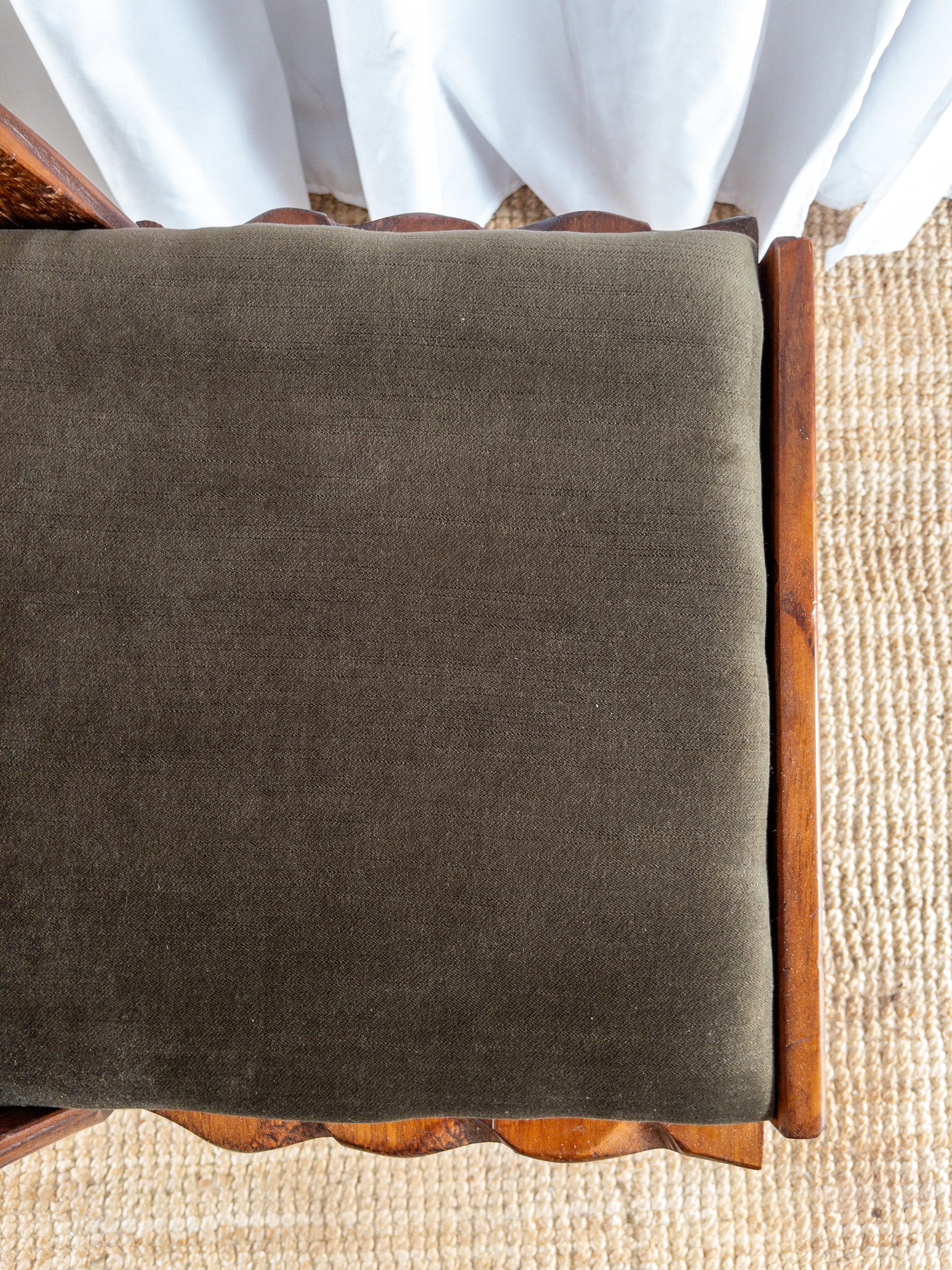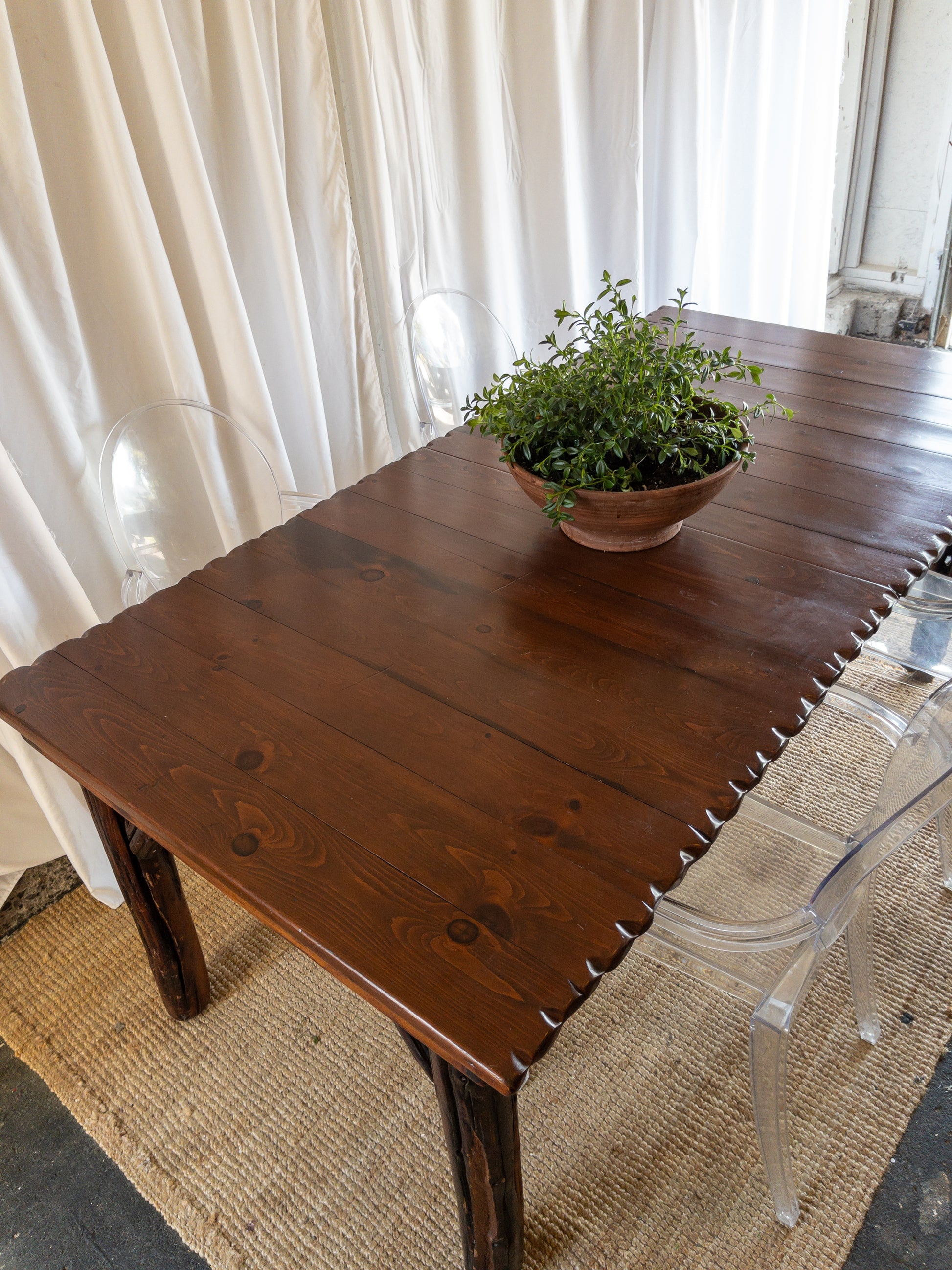 Brutalist handmade wood dining set. This sculptural masterpiece is made from sturdy, hard wood for long-lasting durability and features organic wood legs and details, finished with a removable velvet cushion. The only one of its kind, this dining set will elevate your dining experience to a whole new level. Custom made, circa 70s-80s