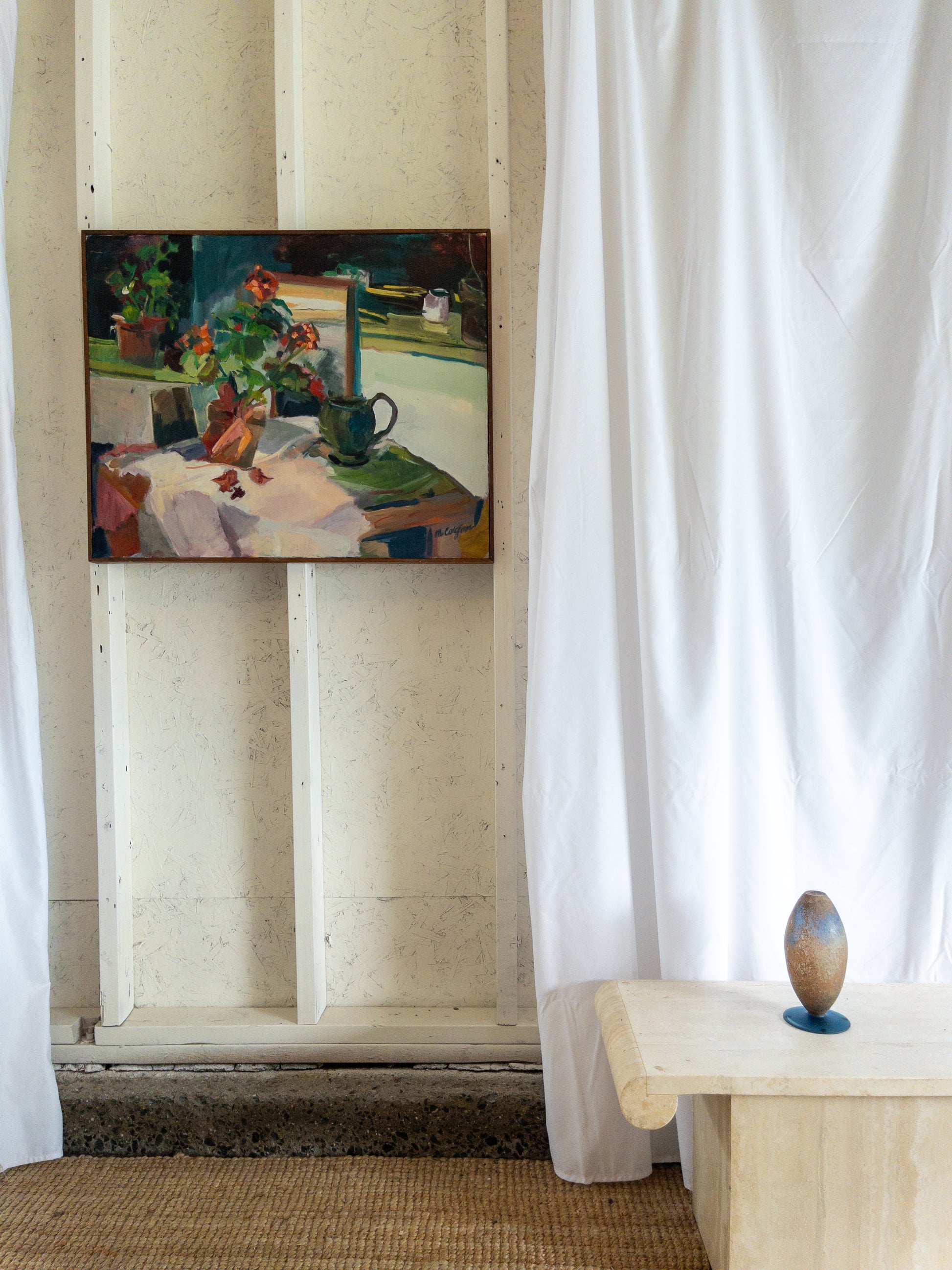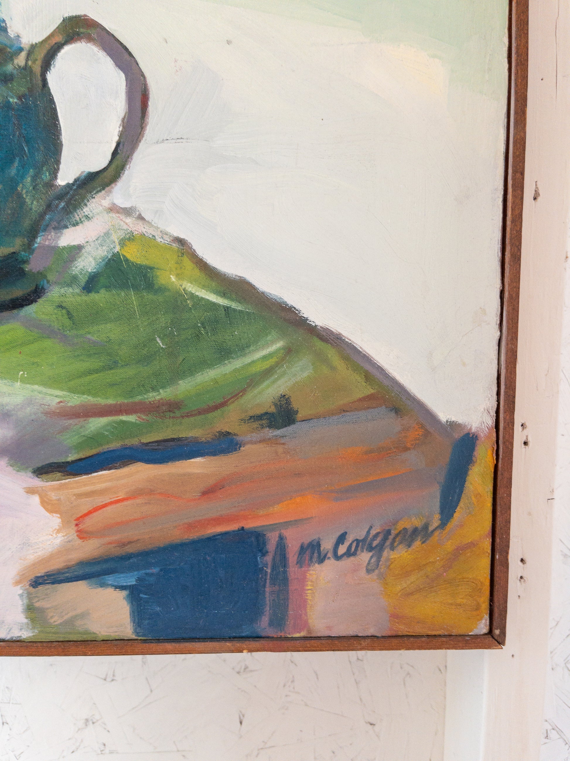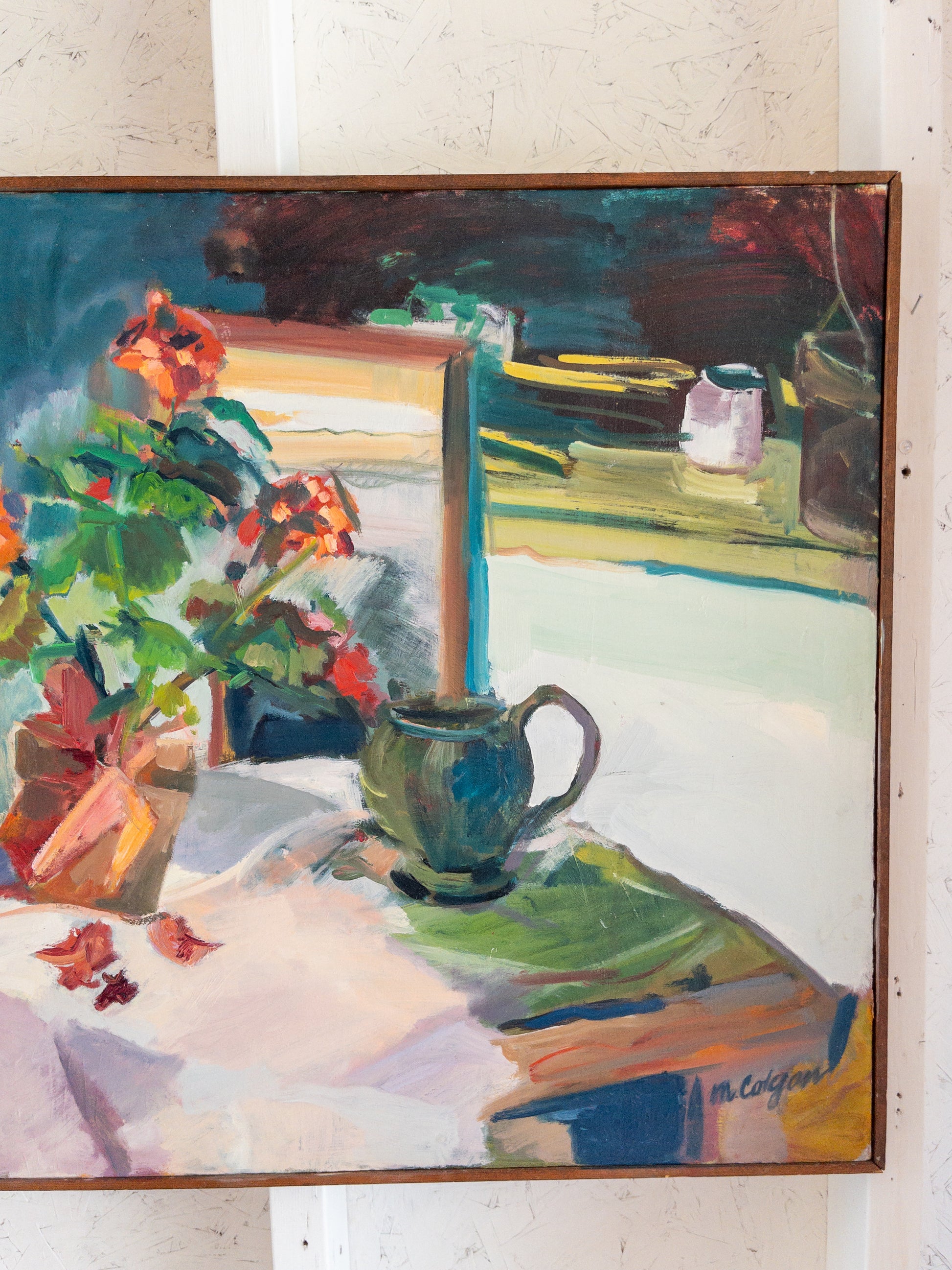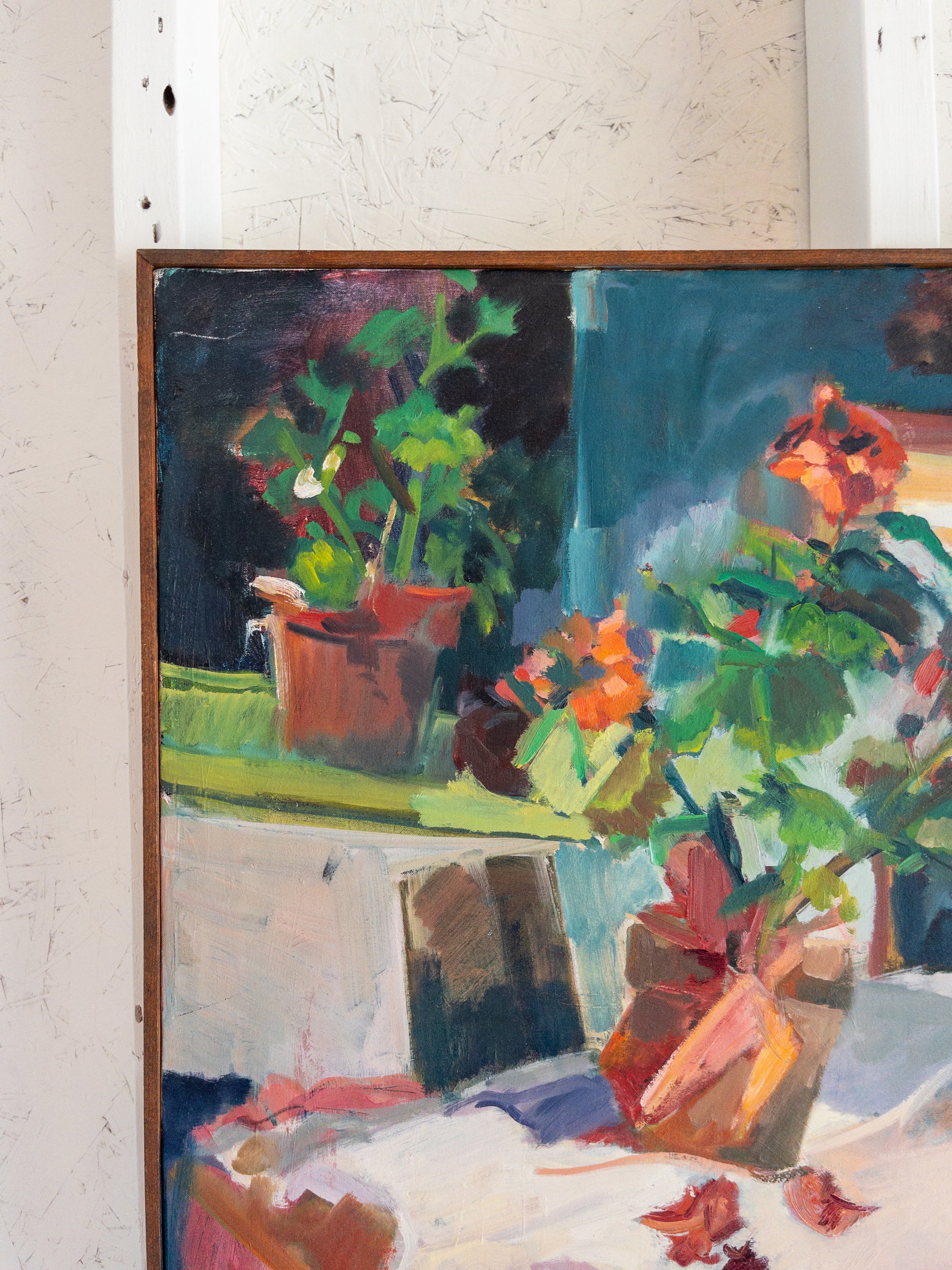 large still life oil painting on canvas. "geraniums" signed, by Martha Colgan. In original frame.