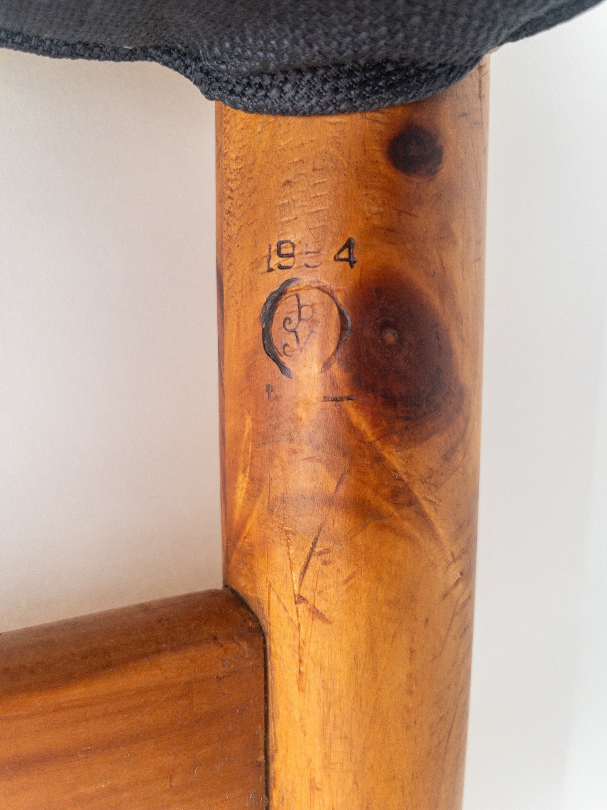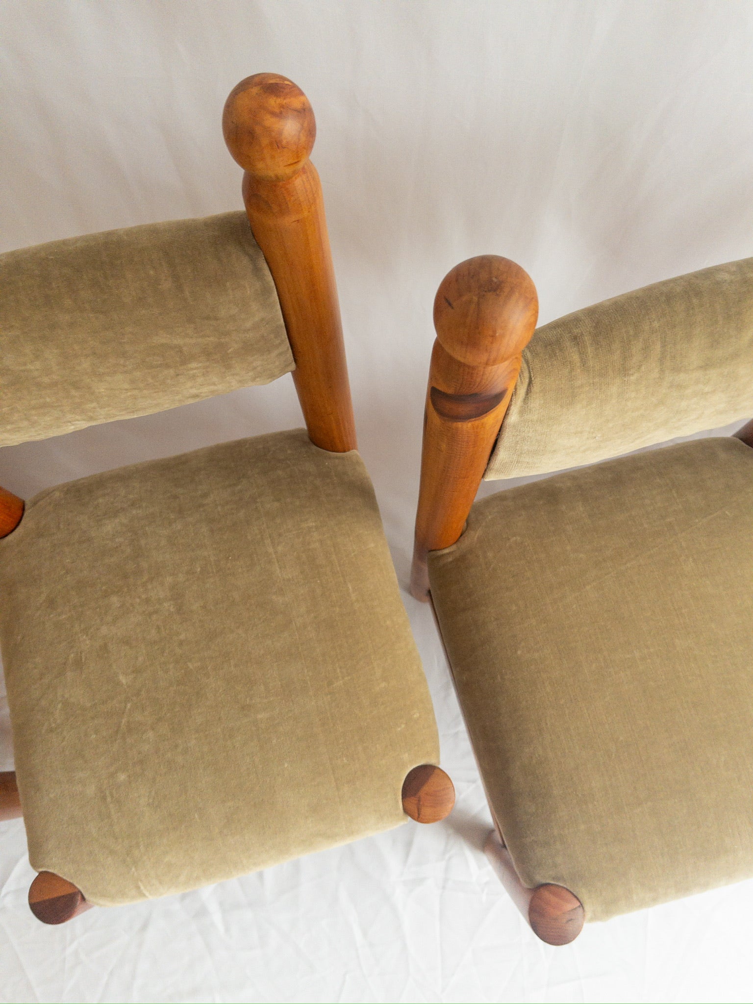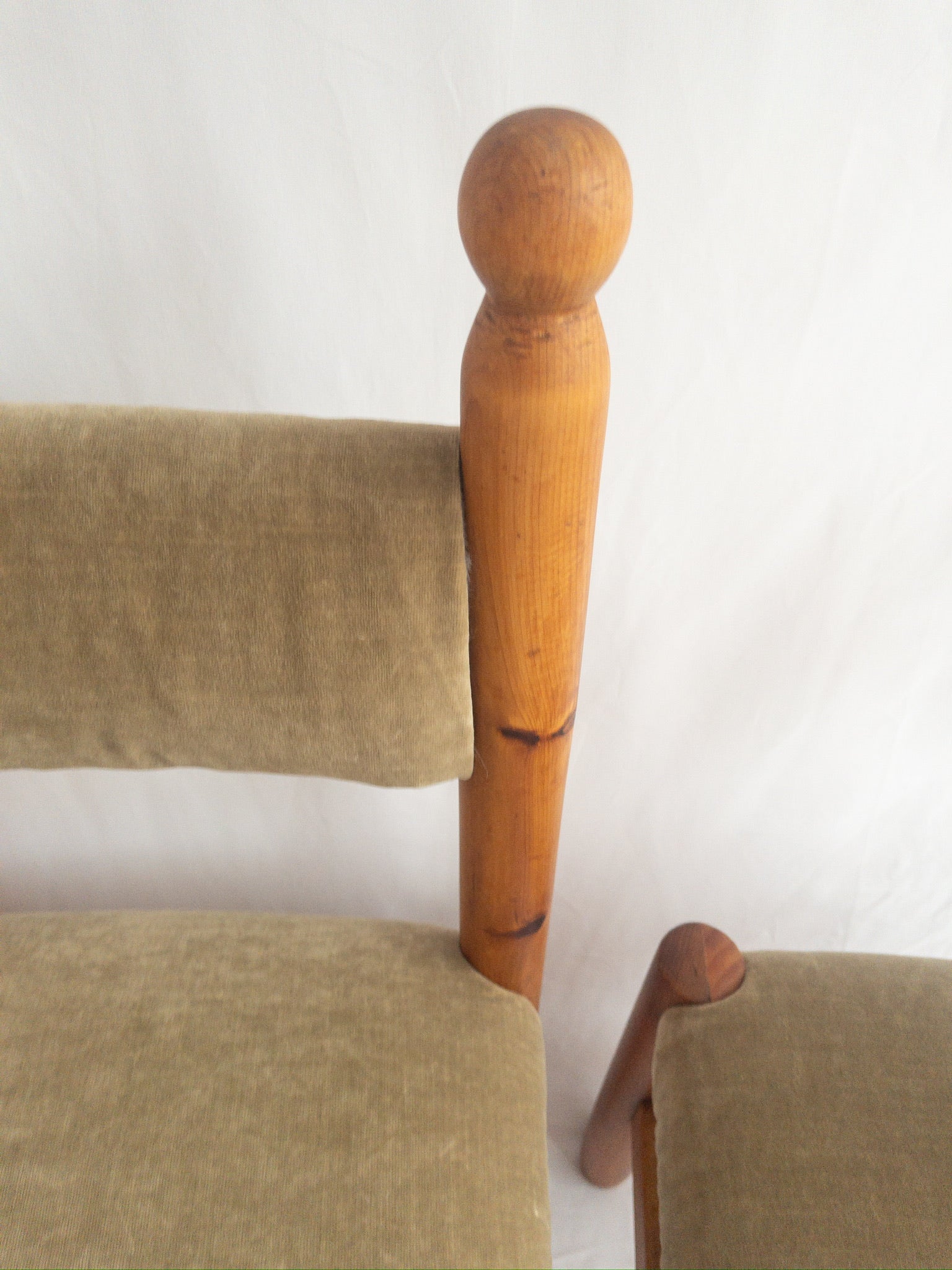 1984s pine chairs. Refinished to keep the age in the pine, expect some marks on the wood, but has also been smoothed over and resealed for longevity and durability. Reupholstered in a balsam fir green grey velvet with a bit of extra cushion, colour is true to photo. fire branded with a personal seal. Sold as a set of 4.