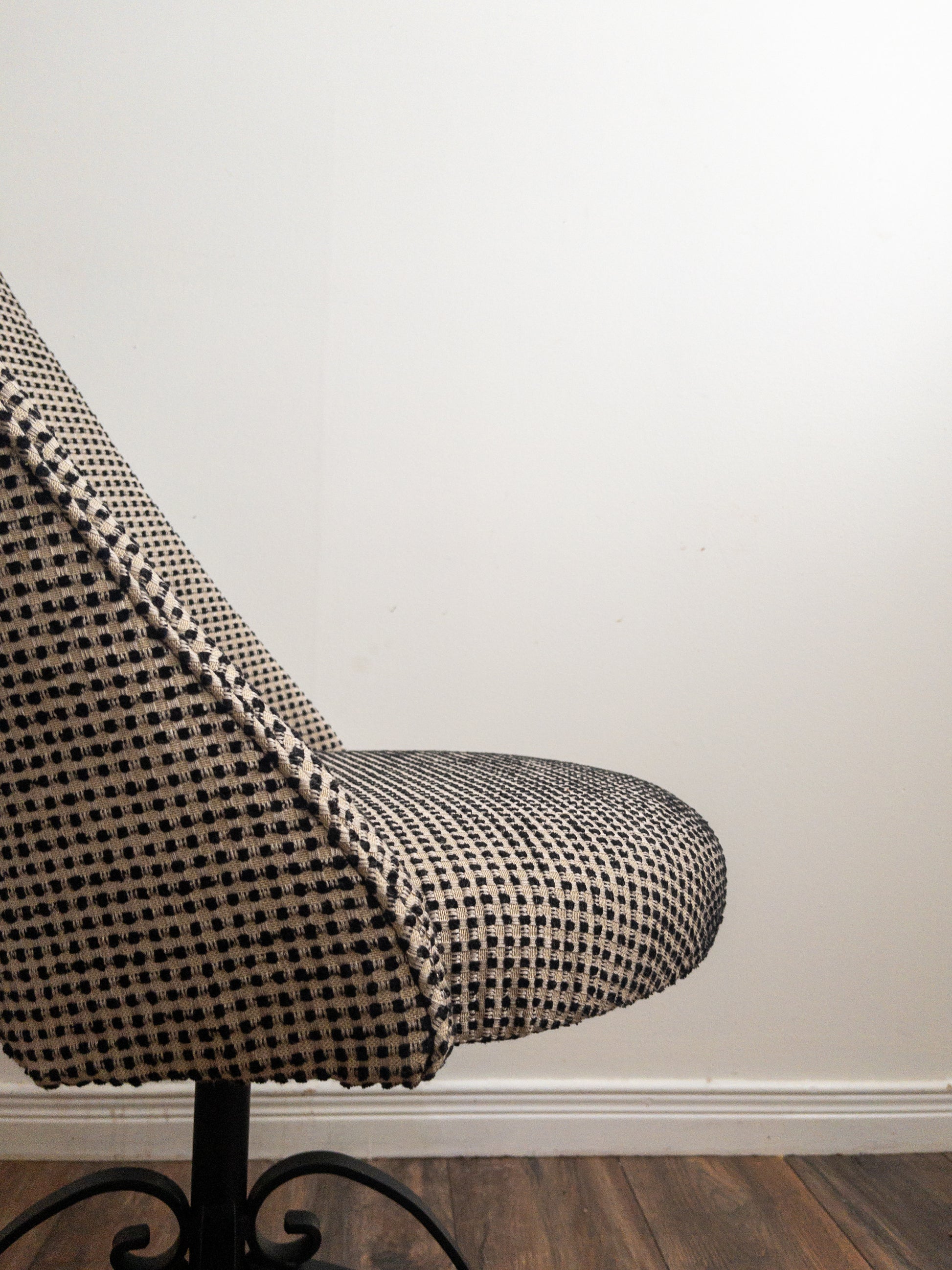 Atomic style swivel chair on a cast iron base. A unique 70s aesthetic reimagined in a gorgeous 90s tweed style fabric.