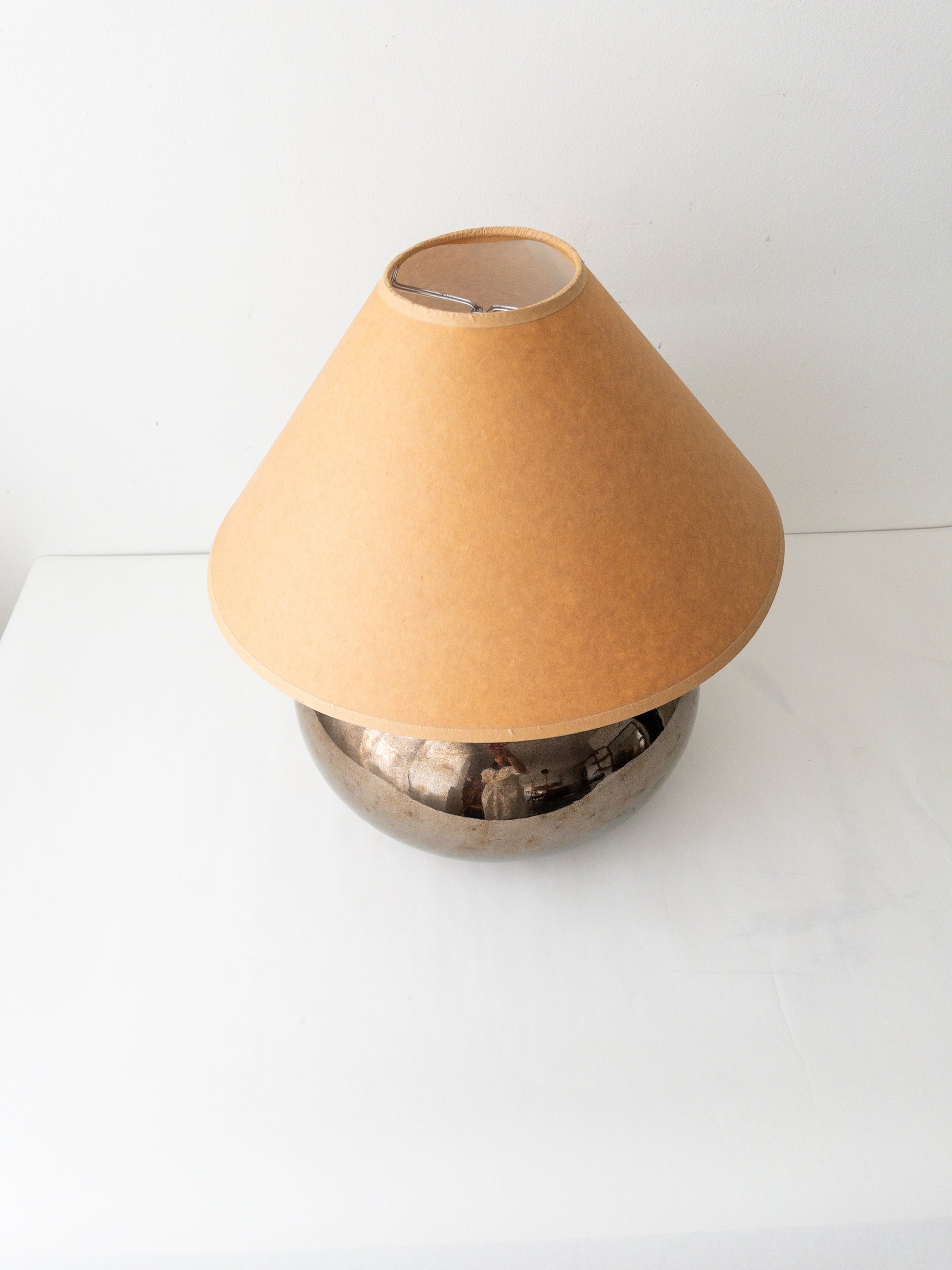 This mid-century ceramic table lamp offers a refined smokey chrome finish that adds a subtle metallic sheen to your space. Paired with a natural Kraft shade. circa 50-70s. Shade included.