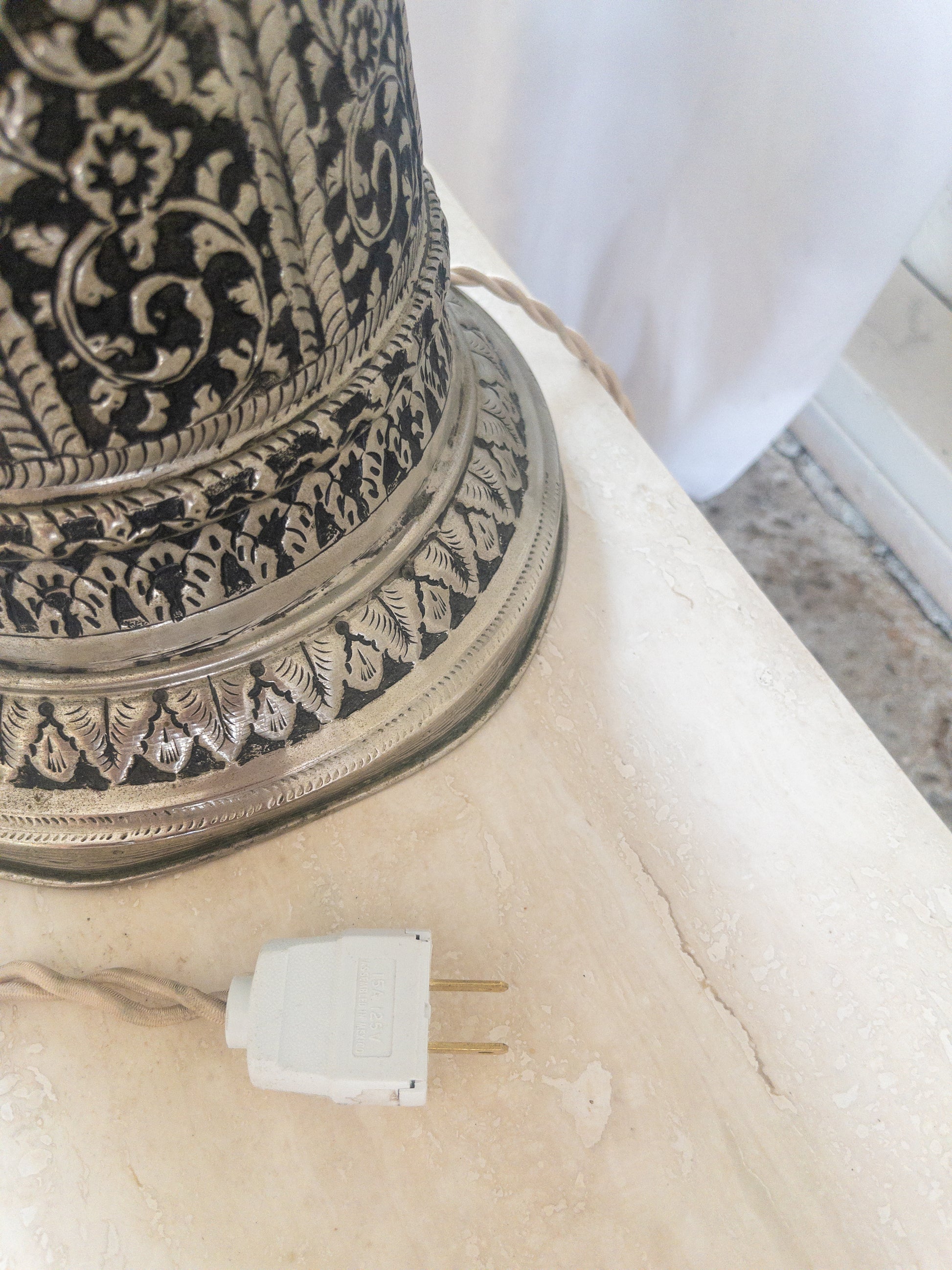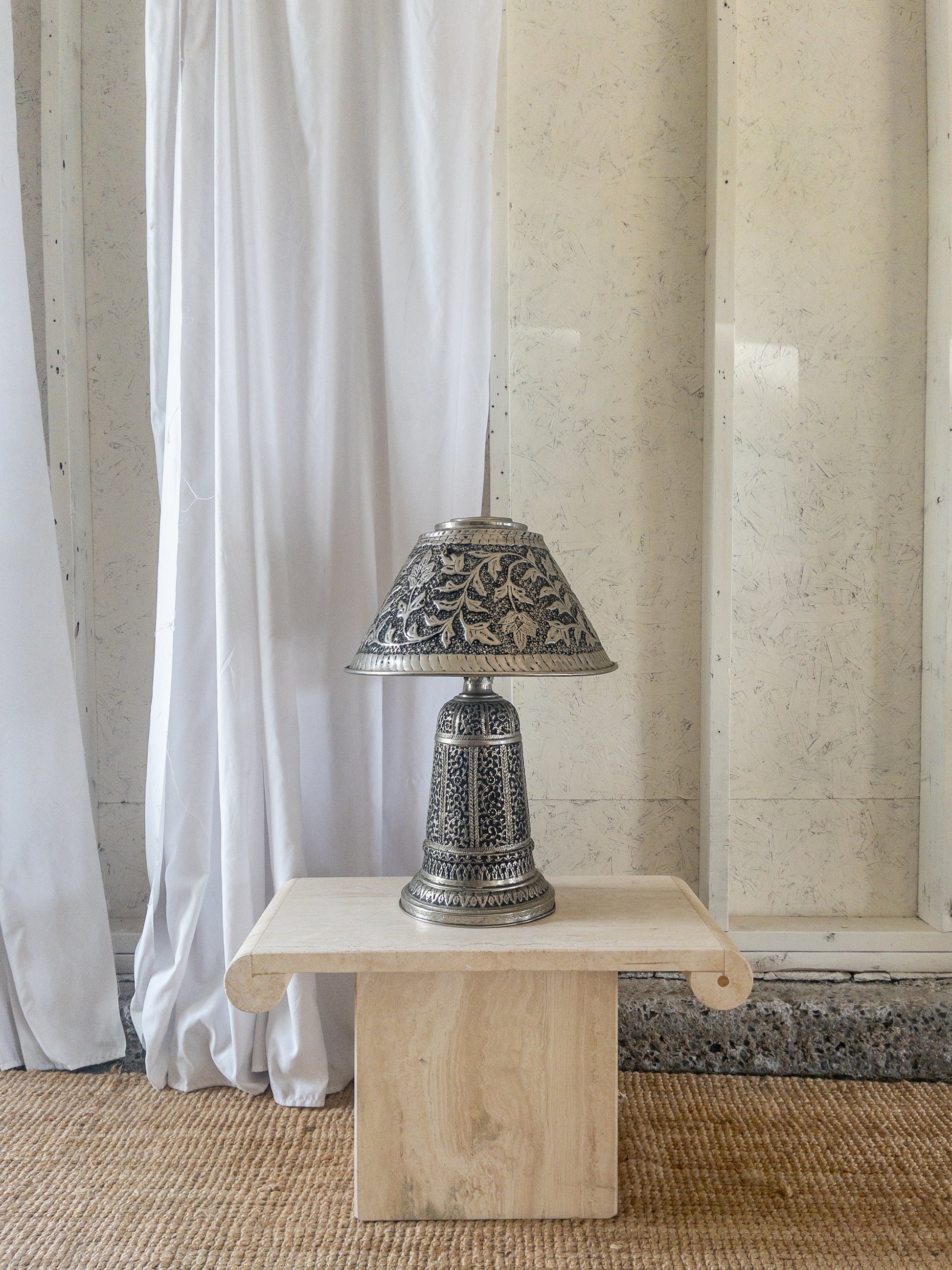 Large punched tin can lamp. likely handmade, shade and base are one single piece.
