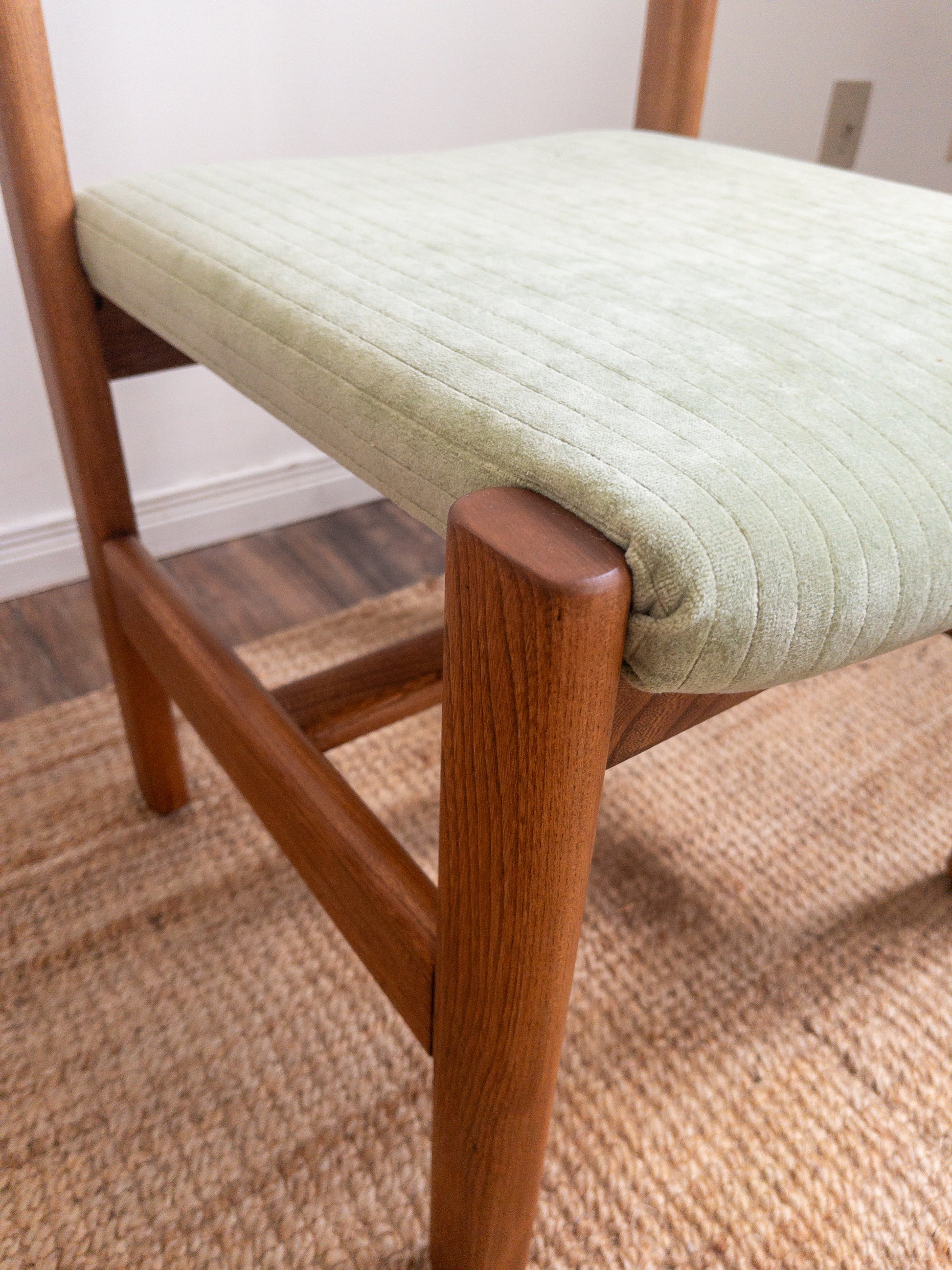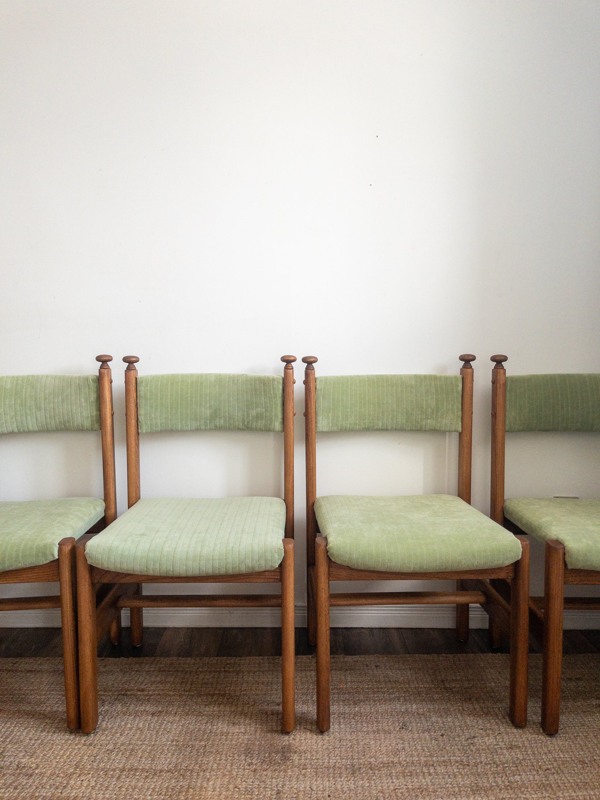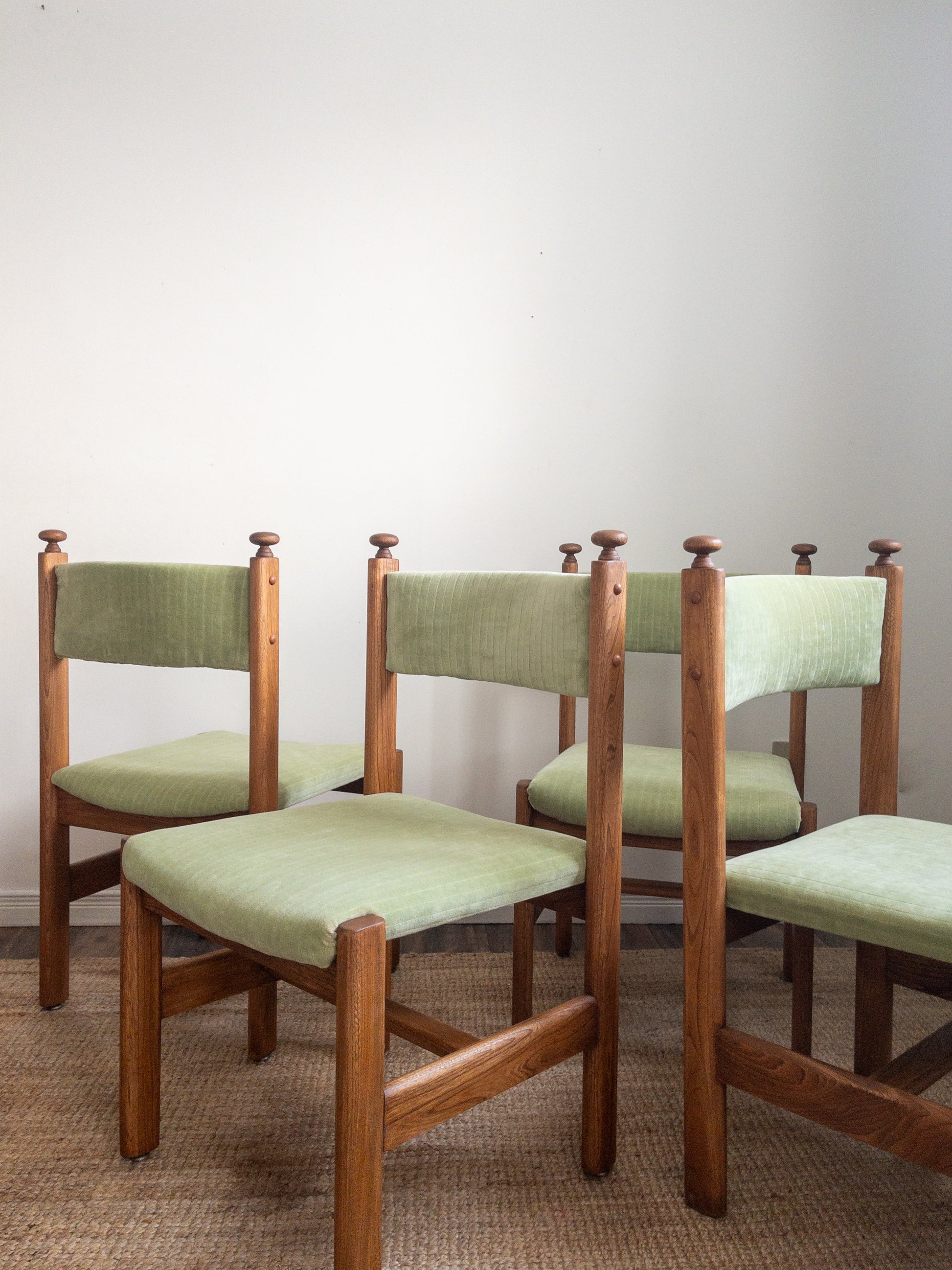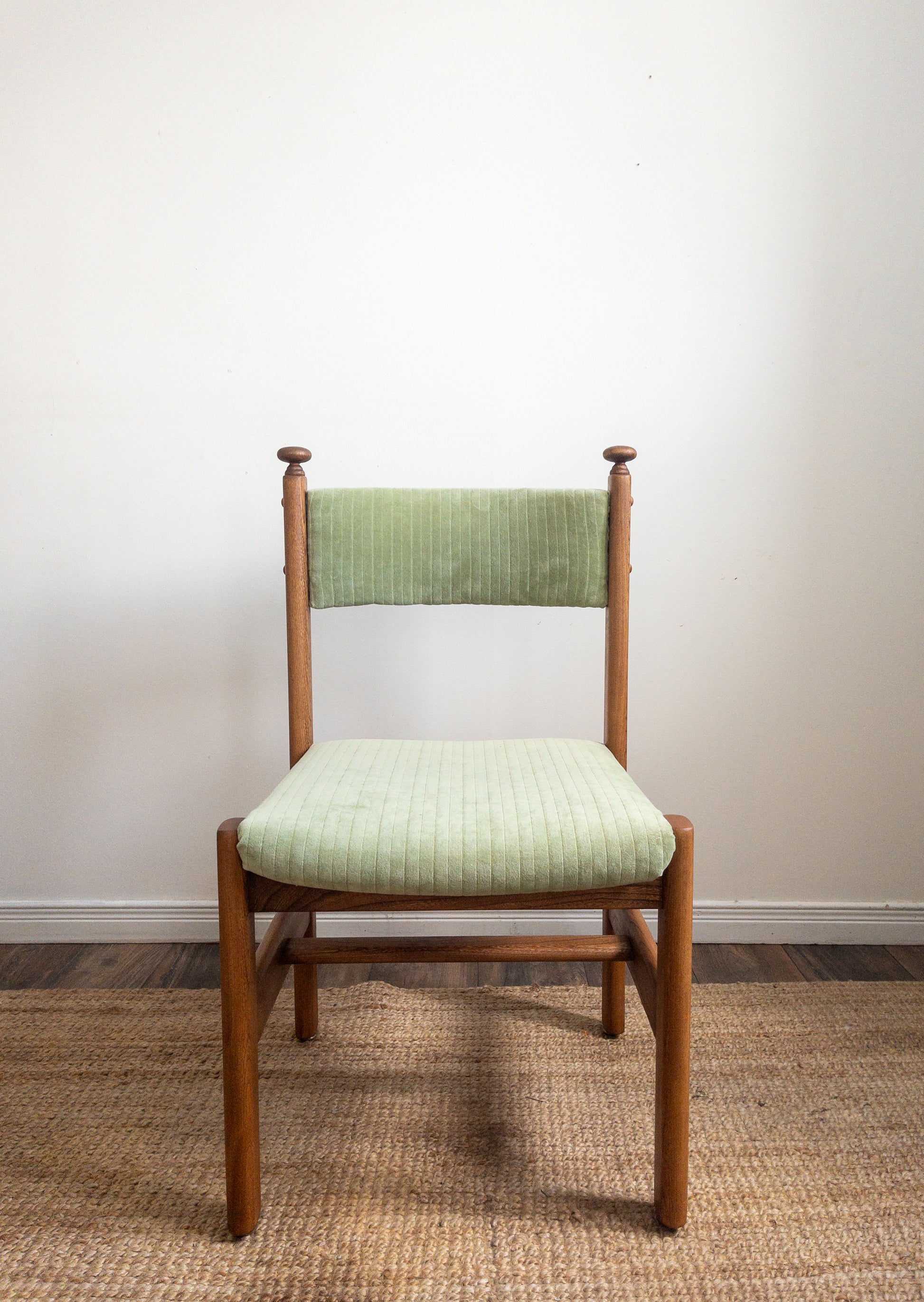 Vintage solid oak dining chairs with light green velvet fabric with the cutest top knob detail. Set of 4.